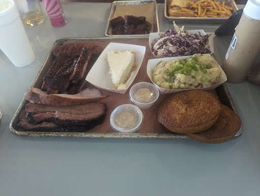 Read moreOh my! You have to try this place!! For me, I like good food, a nice atmosphere and customer service is a must. This place has it all! We had a group lunch for work with 8 people, so we decided to order the meat by the pound to share and each get individual sides for ourselves. We had the brisket, link sausage and ribs. The brisket was very tender and flavorful. The link sausage was tasty. The ribs were delicious (personally my favorite part of the whole meal). They were very tender, fell off the bone and the pepper coating was amazing! They have 3 sauces to choose from on each table. The "Sweet Red" was my favorite. For my sides, I got the coleslaw and loaded potato mash. The slaw was purple cabbage, with just the right sweet with a slight sour and a good crunch. The loaded potato mash was terrific with bacon pieces throughout. Everything was so very good! The atmosphere is different than most BBQ places. It's nostalgic meets hipster (in a good way). They have an open concept with plenty of tables inside. They also have a nice covered patio with fans that wraps around the front and the side with a little play area for kids. There are items for purchase throughout the restaurant like koozies, t-shirts, sauces, hats, etc. During our stay, we heard a little bit of everything over the music speakers. True Texas Country like "My Hometown" by Charlie Robison and also Johnny Cash's cover of "Personal Jesus" and similar music between. One of the coolest things was a loop of a black and white old western called "The Gabby Hayes Show". It was presented by a projector on the walls. I had never heard of this so I did some research after our meal. The first episode of this old show was in 1950. I loved this nostalgic piece of the atmosphere. Very different and unique. The service is excellent. We were greeted warmly, our order was taken with a smile and we were offered suggestions about the menu. A++++++++ job! Thoroughly enjoyed this establishment. We don't work on this side of town, but we had heard good things, so we decided to take a short drive to see if the hype was real. It is real! Go...