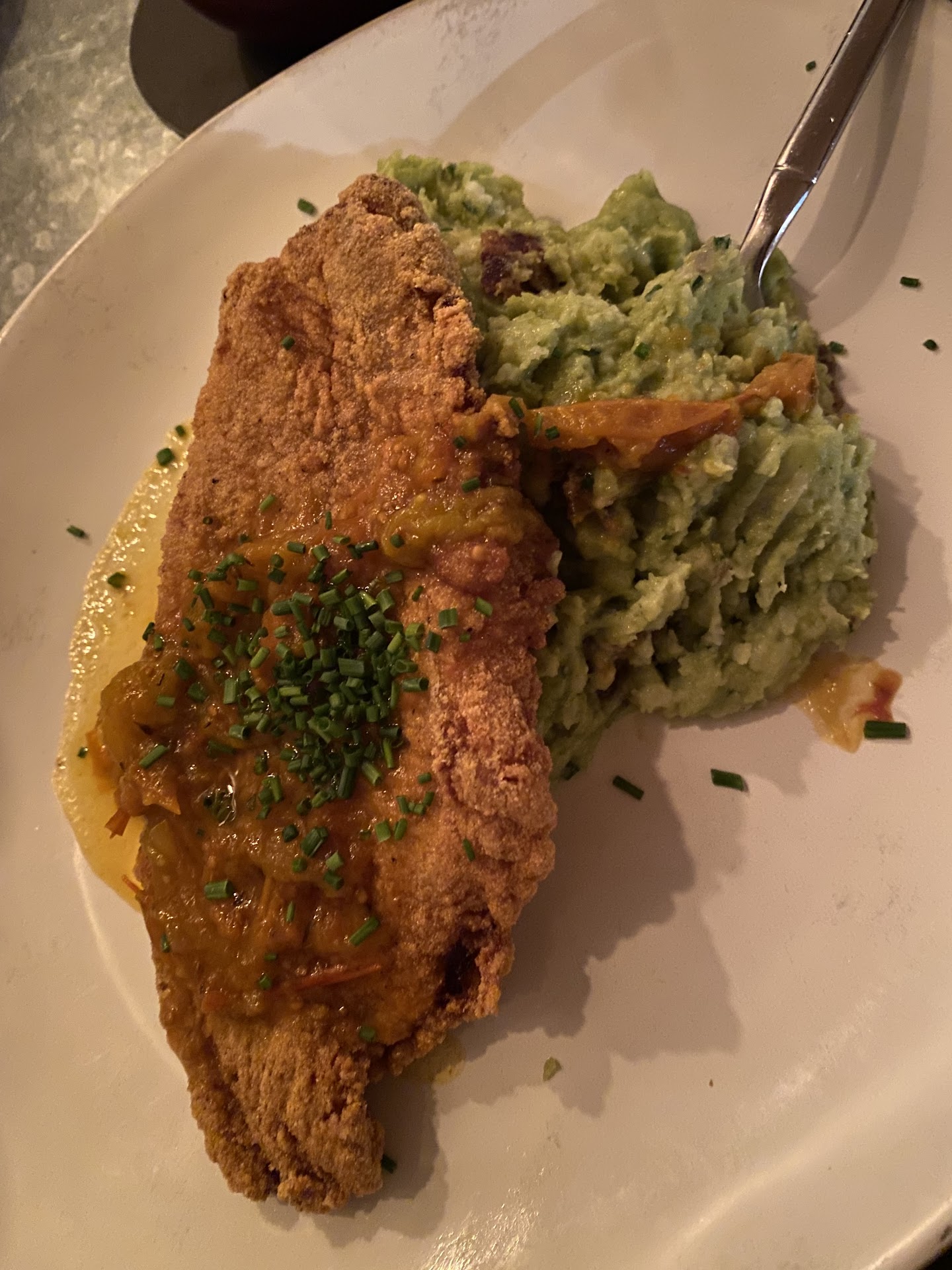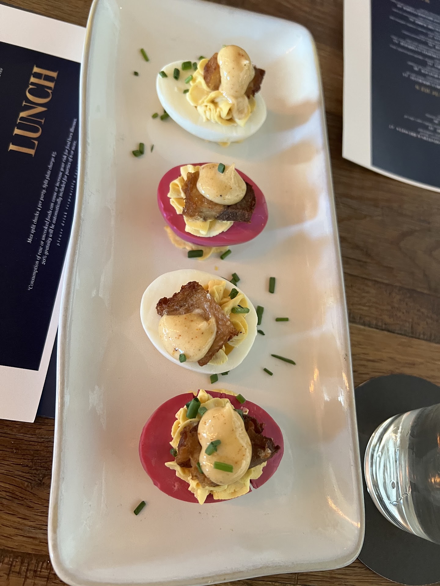 At first appearance there is a quaint homey vibe to the restaurant with an open door to the kitchen. Looking in there’s really nothing to look at but a narrow hallway to a partial view of a prep table. But there was plenty of kitchen noises coming from that direction. The appetizer menu looked interesting so we ordered the following: Pulpo: I was expecting a tender octopus. What I got was somewhere between a tough grill to medium texture depending on the thickness of the tentacle. There were micro greens on top which didn’t add flavor but perhaps more texture. The tentacles was served bare, sitting on top of onions and a thin layer of sauce. Eating the tentacle as it is was mostly bland with a hint of smokiness and sometimes a whiff of fishiness. I didn’t mind it but my colleagues felt it was off putting. I didn’t get the onions. It felt like an afterthought and the sauce could have come from my bottle of Thai chili sauce at home. Pimento Cheese Fritters had a nice crunch to it and the flavors were nice but I think I was thrown off by the molten texture inside. It was some parts molten and some parts stringy. However I did like it. The Artichoke was just a pickled artichoke dipped in batter and deep fried. They were okay. Kind of reminds me of deep fried pickles. The Deviled eggs were just good deviled eggs. The square crispy bacon was a good crispy bacon. I couldn’t tell the difference between the Berkshire and a normal pork belly. Simply because it was too small to detect a difference. Crispy oysters and Brussels. Oysters were topped off with a aioli. It was a pleasant bite. I didn’t touch the Brussels so I can’t comment on them.