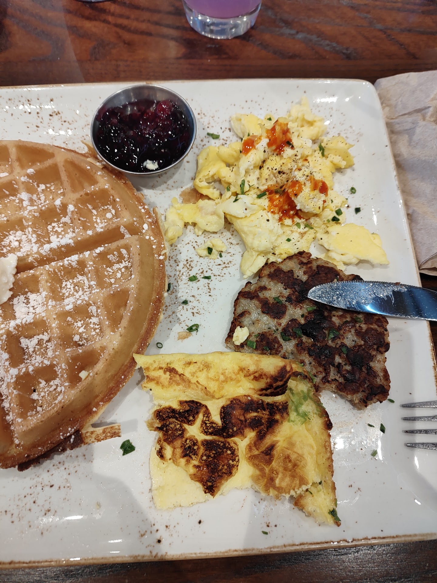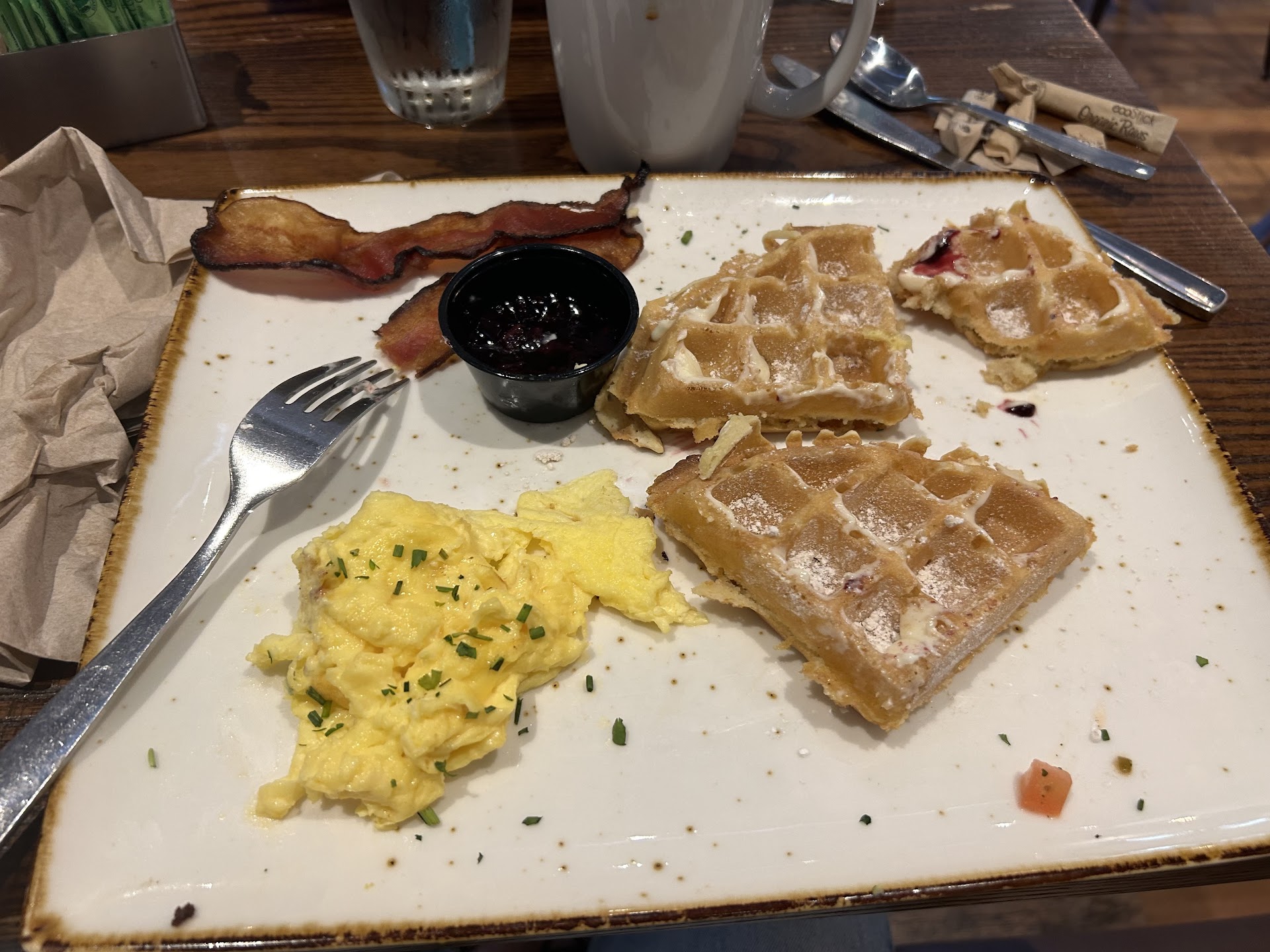 I had a French toast breakfast consisting of two pieces of toast, two scrambled eggs a-la carte (with chives added), bacon (also a-la carte), and an orange juice. There was no “combo platter” type deal. The French toast reminded me of a long-departed local chain, Le Peep. Anyone longing for French toast like they had will be quite happy with First Watch's version.