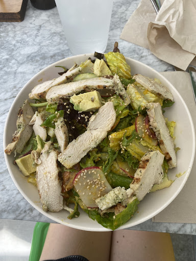 Our food was brought out quickly and just they way we asked. My mom and I both ordered a salad and they were both delicious! I got the chopped vegetable salad with grilled chicken and I substituted the dressing for their lemon avocado dressing. My mom got the Turkey and avocado Cobb salad. She substituted the cheese for cheddar cheese and also got the lemon avocado dressing. The lemon avocado dressing is amazing! One or our favorite dressings ever! Also, we both loved and appreciated how crisp and fresh the ingredients in our salads were. My mom also appreciated the extra step they took in serving her rose in a chilled glass.