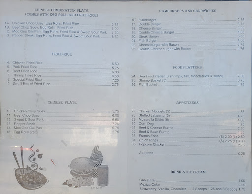 Read moreWe LOVE this place to eat! They have excellent burgers and Chinese food (the best chicken fried rice I've ever had!) plus many other food choices! Also, the couple that owns and operates it are the nicest people and so pleasant. I highly recommend this place to eat, however there is only outdoor seating. We always get...