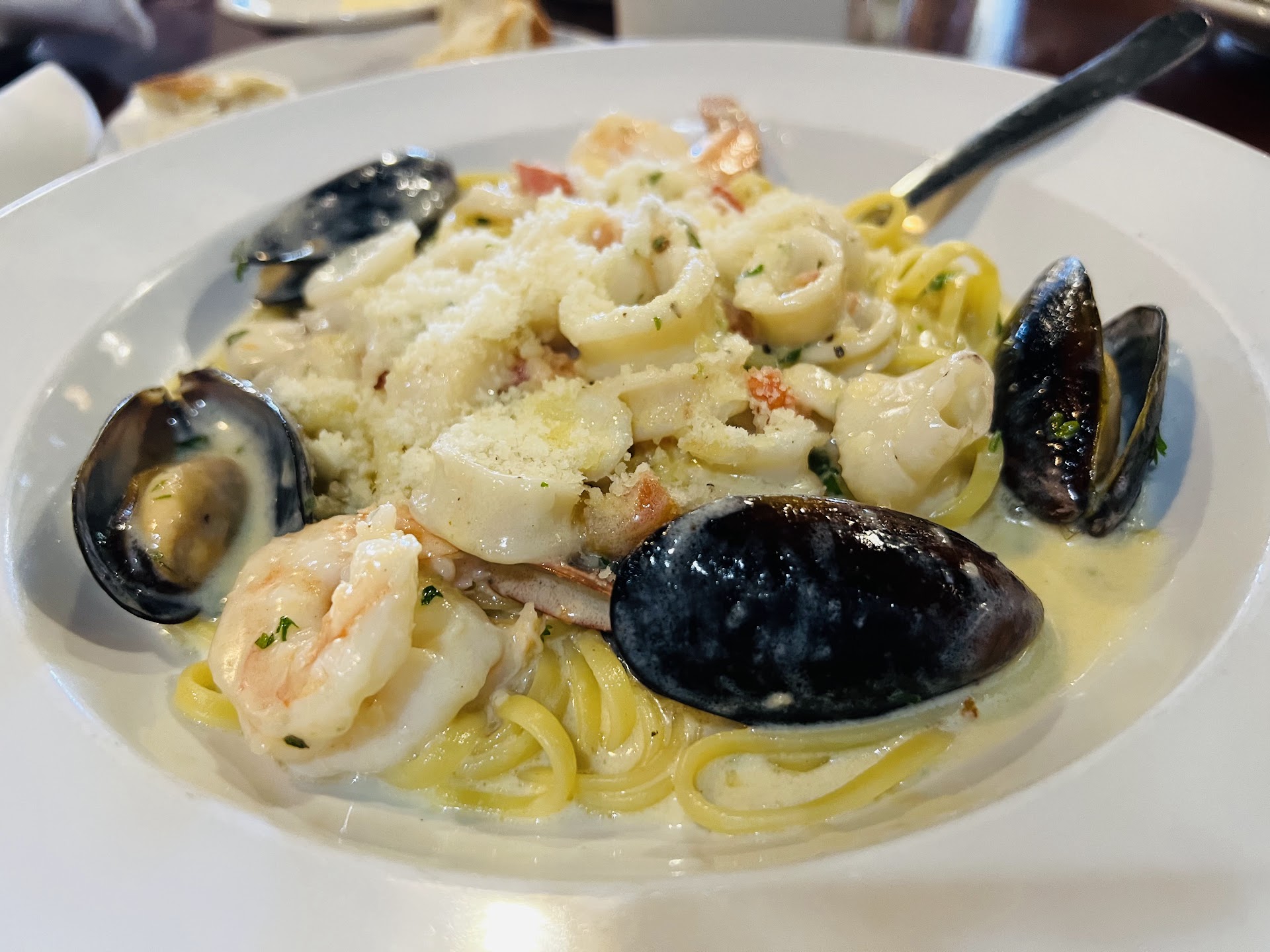 Reviews like this are tough to write. There is so potential, but I’m doubtful things will change as the business has been open for many years. I got a “set in our ways vibe”. This once bustling shopping center, has turned into a desolate area. I wouldn’t be surprised to see tumbleweeds. The entrance itself, is grand. You walk up a few steps to see patio seating on either sides of the entry doors.They also have a ramp for handicap needs. My first issue was the specials board placed outside. Instead of reading specials, or welcoming you into the establishment, it’s simply states to not leave valuables in your car. Not a warm and fuzzy feeling. We went for an early dinner on this particular day, so it was not busy. Only one other table of two were in the restaurant. We were immediately greeted and seated by our waiter. He was extremely friendly, attentive, and helped with suggestions from the menu. He told us he had been there 29 years. The space itself has so much potential. There’s a beautiful mural of old world Italy on a large wall. The lighting is low and intimate. They have decorative wine cellars separating the bar area from the regular eating space. Unfortunately, boxes stacked behind a high backed booth seating area on the opposite corner of the restaurant, took away from the beautiful mural. It was definitely a storage area for wine boxes. As we waited for our drink orders to arrive, I noticed the music did not fit the environment. Britney Spears, Huey Lewis, Maroon 5, and other pop artists played overhead. I would expect an Italian restaurant to have more themed music. Sounds of Frank Sinatra and Dean Martin would have been very welcomed. We ordered the stuffed mushrooms for an appetizer. They were very good. They were large and had a tasty cream sauce. Four to a plate, which was perfect to split between the two of us. While we talked and enjoyed a couple of glasses of wine, we looked over the menu and decided to ask our server for suggestions. He was very helpful. He suggested the Chicken Jerusalem for me since I was in the mood for a creamier sauce. Turns out, there was both cream sauce and marinara sauce, so I got the best of both worlds. The food itself was pretty good. The garlic bread was the best. For my aunt and I to dine that evening, the bill was $161 before tip. This was three glasses of wine for each of us an appetizer, our meal, an order of garlic bread, and one tiramisu. I felt the prices were a little high. My aunt had a steak which was $35 by itself. She did not feel it was that great, so at least my meal was better than hers. Before leaving, I headed to the restroom to check out that space. Ceiling tiles were removed and wires exposed, there was trash on the floor, the toilet was not solidly positioned to the floor, and the countertops were littered with debris and extra water. It’s such a shame to have great service and decent food, but have it ruined for things like music and atmosphere. My hope is for someone to see this review and tweak a few things that would be beneficial for their business. Unfortunately, unless I hear things have changed, I will not return. we still tipped our waiter 20%. Like I said, he was a good waiter. Maybe the restaurant is just a little...