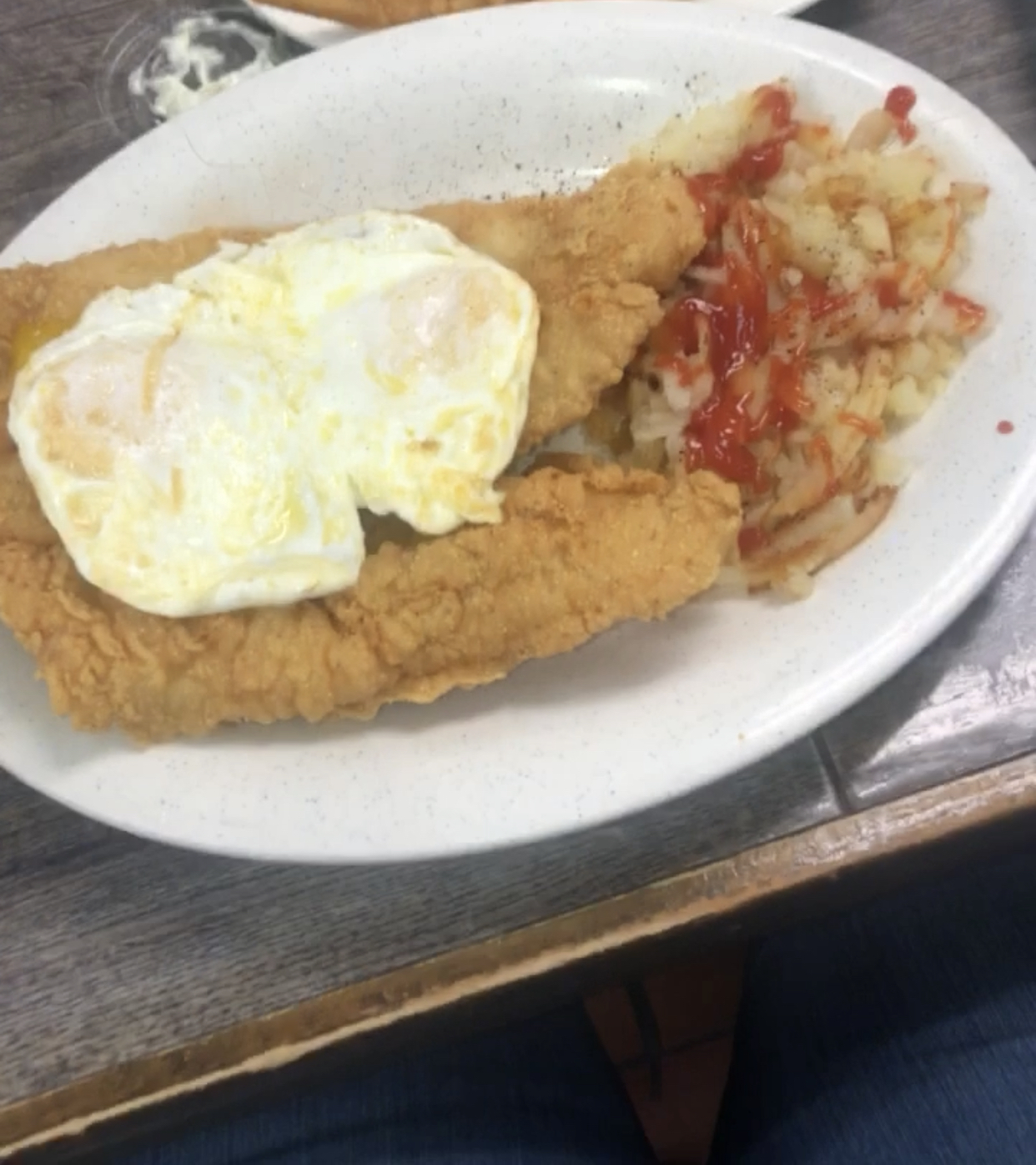 Read moreWe got 3 Breakfast specials with a large side of gravy, a waffle breakfast, and a fish and waffle combo. they don't have iced coffee options so I ordered a hot coffee. Let it cool off got a cup of ice and added my cream so it worked out. There were a couple of mistakes with our order. First, the waitress misunderstood my son, and brought chicken instead of fish. This delayed our food a bit, but everything else came out correctly until our "dessert" This was a birthday celebration And we ordered the chocolate chip waffle special and got a chocolate chip pancake with just a little whip cream on it. The waitress argued, saying I said pancake, but I hate pancakes and we had predetermined to get the chocolate chip waffle as a birthday cake if you will. So I told her will pay for the pancake just bring back the waffle and I wanted the one that's pictured under the title, chocolate chip waffle that has whip cream and chocolate, drizzle, powdered sugar, and a cherry on it. She just brought back a plain old waffle made with chocolate chips in it and a couple blobs of whip cream. Disappointing. Overall, the food was decent tasting with the exception of the fish. Part of it was good, but then my son said parts of it were hard and inedible. The scrambled eggs were a little dry more over cooked than just scrambled hard. The sausage was overdone and crumbled a part but it still tasted good. The bacon was good quality, thick bacon. The pancake was average, the waffle was good but a little softer like a pancake, rather than your crispy version. The hashbrowns were almost mashed potatoes. The grits were water down and lumpy. The gravy was bland until I added the crumbled sausage, but it did the job. I was surprised, considering all the great reviews. The facilities are clean with the exception of the ceilings being a little dilapidated. The parking lot is rough. I'm not sure if we'll be back especially since I ended up paying over $100 and not really getting what we...