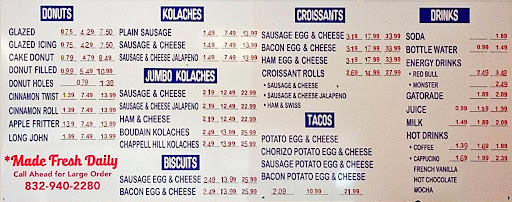 Read moreWhat an incredible experience at this kolache shop! We placed a large order of 60 kolaches, and not only was everything ready in under 10 minutes, but they also generously gave us complimentary donuts. The service was impeccable: the lady who helped us was incredibly kind, especially with my son. She let him choose his favorite donut and even gifted him a lollipop, which absolutely made his day.