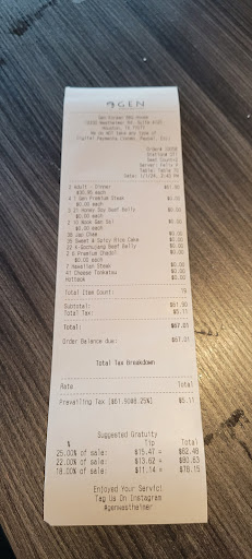 Read moreI've been to Gen multiple times, the one on Louisiana St, in Houston as well as a few in Dallas. This by far was the worst experience I've ever had at a restaurant in a long time. Initially, no employee was there to greet us and we waited about 15 minutes for someone to notice us standing there and seat us. We were a group of two. While waiting, another group of 6 to 8 people walked in. Which wouldn't be a big deal, but the waiting area up front fit about 4 people in total. Even with the other group arriving, it was still about 6 minutes before an employee noticed us.