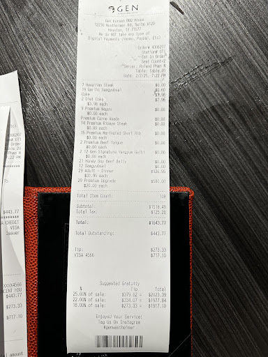 Gen Westheimer Female Manager from Sunday 2/2/25 IS TERRIBLE! MEAT ALSO SUBPAR. Will never ever return to Gen Westheimer location. Make sure Gen actually has all Premium Menu Items Available before opting for the $20 more expensive premium option ($51.95 vs $31.95). Don’t cheap out on tip for waiters/servers just because their manager is the worst (we still tipped 18% on receipt despite being straight...