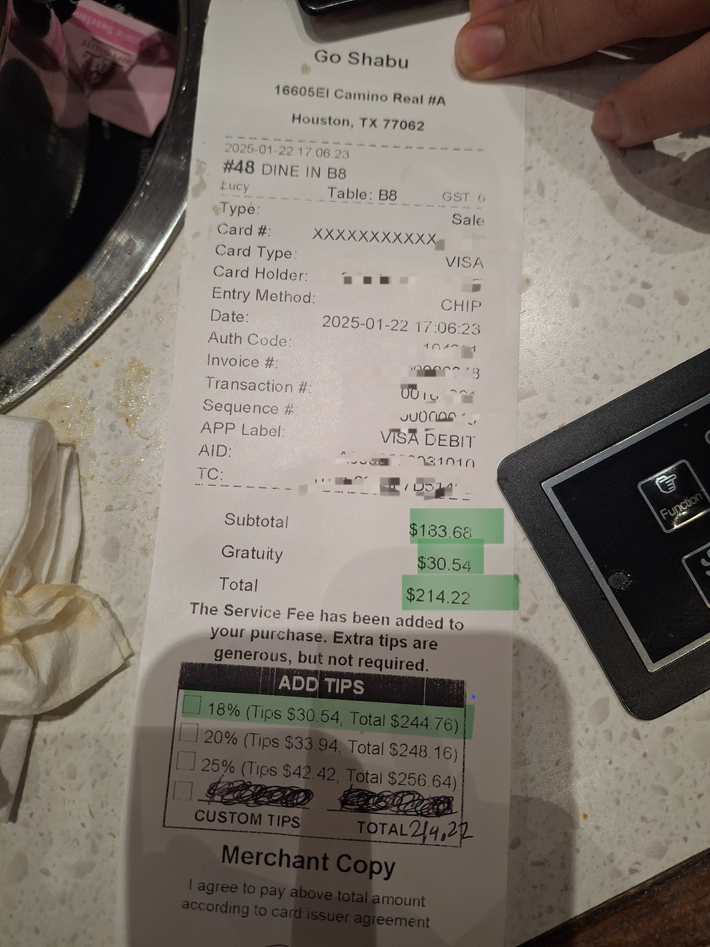ย ย ย Read moreThe food was excellent and this would be a glowing review if they hadn't tried for the second time (and almost succeeded) to trick me into double tipping. This is deliberate. Look how they added gratuity already and then present options for a tip on top of that which is coincidentally the same amount as the gratuity (and is NOT 18%). $183.68 + 30.54 + 30.54 = $244.76. They're double dipping! It's not even an accident. Look how $30.54 isn't 18% of 183.68 OR 214.22. Made up numbers, trying to trick you into thinking it's a option to tip the default gratuity ($30.54, "18%" (not 18%)) or just a little more. Mind you this is the bill for a family of 6, so the amount they're charging is already ridiculous before the double dipping tip scam. They don't need a $72.96 tip when all they did was bring bring meat out twice and drinks twice. They charge enough to pay their employees enough to not need to scam people for double tips. I didn't make a fuss about it the first time we came here and they almost got us with this scam because it was the first time we ever ate there and I gave them the benefit of the doubt that it was a mistake. But that was over a year ago and they're still pulling this. It is no accident. If your party is bigger than 4 beware!