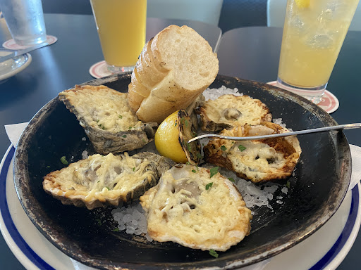 -When it came down to ordering our meal. Bow gave us lots of recommendations and even shared items off the menu. For appetizers we ordered the mesquite grilled oysters with garlic butter Roman cheese. It was so darn good, I was scraping the shell for more LOL. For our entree, my husband orders the redfish topped with crab meat and with two jumbo shrimp stuffed with jalapeƱo white cheddar wrapped in bacon! Absolutely amazing. I ordered the mesquite grilled salmon. Incredible smoke flavor, I canāt get over how perfectly grilled this salmon was. So juicy, a tiny bit under in the middle, this is how salmon should always be done! Simplicity done at its finest. The only critique is the seafood rice for our side. Itās very underwhelming, nothing exciting just two baby shrimps and a sliver of fish mixed with rice. But the small shrimp empanadas side was tasty!