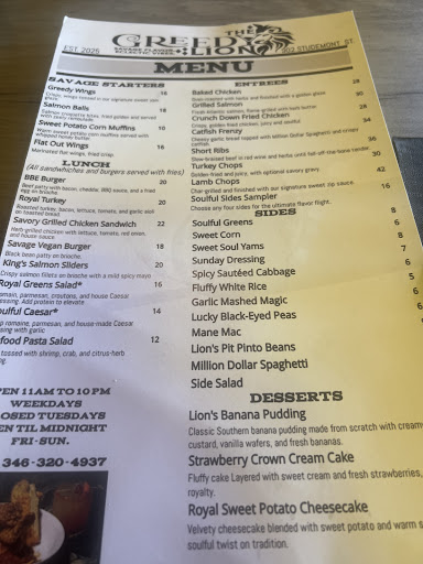 Went to the Greedy Lion on a whim on a random Friday afternoon. I was surprised to find they were located in a wine bar weād visited a couple times previously. Theyāve only been open a month so fairly new. Overall we had an amazing time at the restaurant. Once we saw the menu we decided to try āa little bit of alotā A few highlights⦠Service: from the time we walked in the door the service was A+. We were greeted and seated by the Owner, Latanya and our waiter T was great the entire time. Knowledgeable about the menu, great conversation, and on top on making sure we had everything we needed. Appetizers: greedy wings and sweet potato corn muffins were both an excellent choice to start the meal. Greens: I donāt eat just anybodyās greens and Iām a critic when it comes to greens. Iāll order these again and highly recommend. Turkey Chops: as a person who has lived in Chicago for years, I LOVE turkey chops, but have never been able to find them in Houston, until now. Highly recommend and make sure you ask for a side of gravy. Cabbage: delicious. Reminded me of some of my favorite Jamaican spots Corn: iām a huge fan of maque choux and this reminded me of my fav corn dish. Definitely a must order Pintos & Black eyes peas: Both super solid Desserts wereš„š„. We had the banana pudding & some sort strawberry cakeā¦both are on the order again list Drinks were good, my wife had lemonade & vodka cocktail & I tried the red sangria (made to order)