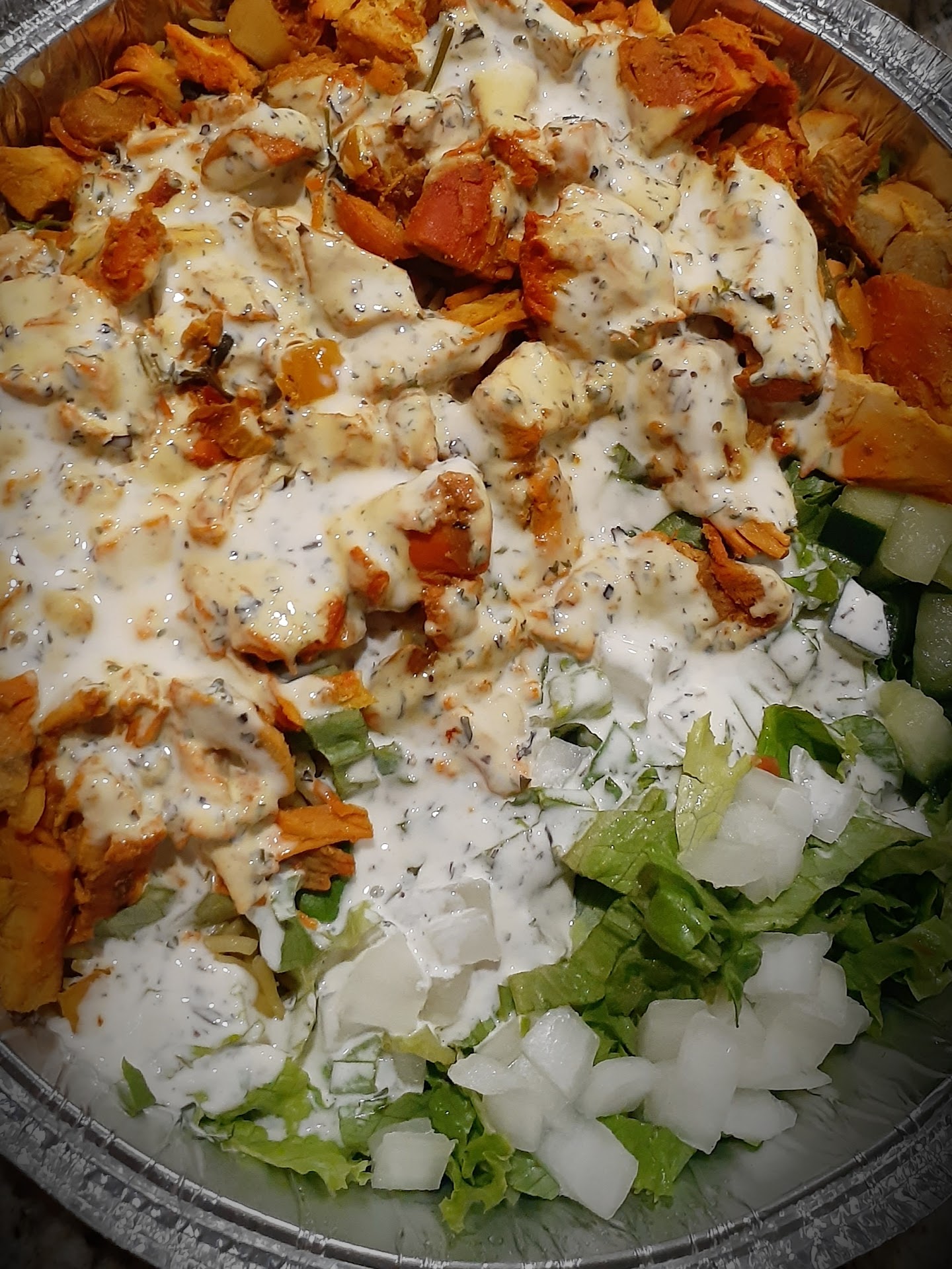 Ā Ā Ā Read moreThe service appeared to be great at first but was all a front. I had two items I order to discover once I arrived were unacceptable. I ordered a falafel sandwich āwithoutā onions & with pickled jalapeƱos. There was onions on the sand which and no pickled jalapeƱos. My second order was a falafel over rice. Once I opened the bowl, it āliterallyā had a puddle of white sauce over half of the bowl. The bowl was disgusting due to the overwhelming flavor of the white sauce. This definitely was the fault of the gentlemen taking our order. Not only did he drenched the bowl in sauce but he did NOT communicate to the cooks our order because if he would have written the order down correctly as it appeared, the cooks clearly would have seen NO Onions! To make matters worse, he drenched the bowl in front of me!! Will not be returning here and I suggest you check your order before you leave. Another unsanitary practice I noticed was the gentlemen who took my order was smoking before he placed my order, was not wearing any gloves while his sweat was dripping on...