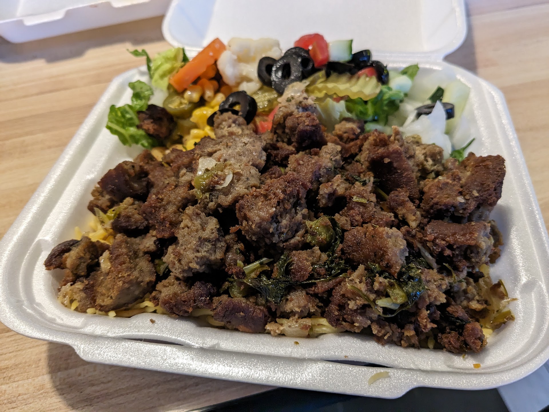 When I placed the order I asked the guy what all is on the chicken over rice bowl. He didn’t answer, so I listed 4 veggies (lettuce, onions, cucumbers and tomatoes) that I was able to read of the menu to confirm with him if that’s all the things that were in the bowl and he said yes. I told him I only wanted 3 of the 4 veggies, so no tomatoes.