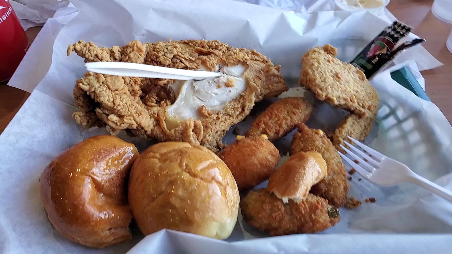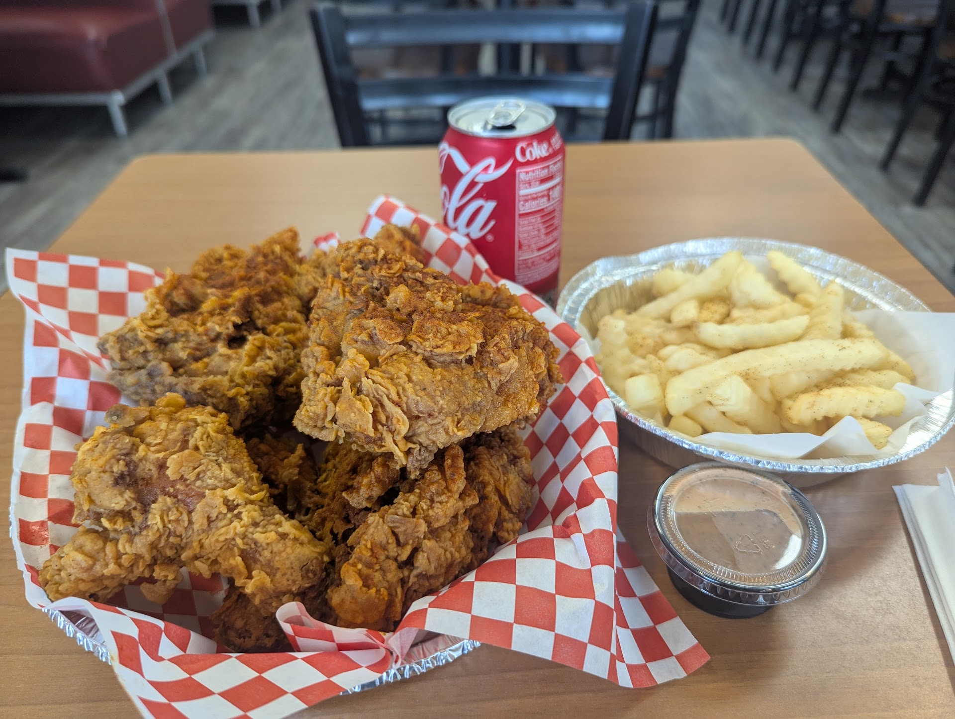I stopped by here today after taking a 2 hour test down the road. I arrived before noon and was welcomed by the two guys behind the counter. The only thing I knew I wanted was fried chicken. Being that it was just mez the smallest size they had was the 6 piece. I figured I can take the rest home. Let's not forget I added fries. The guy informed me it would take anywhere from 15 - 20 minutes. I'm already liking this, hot and crispy chicken 🍗.