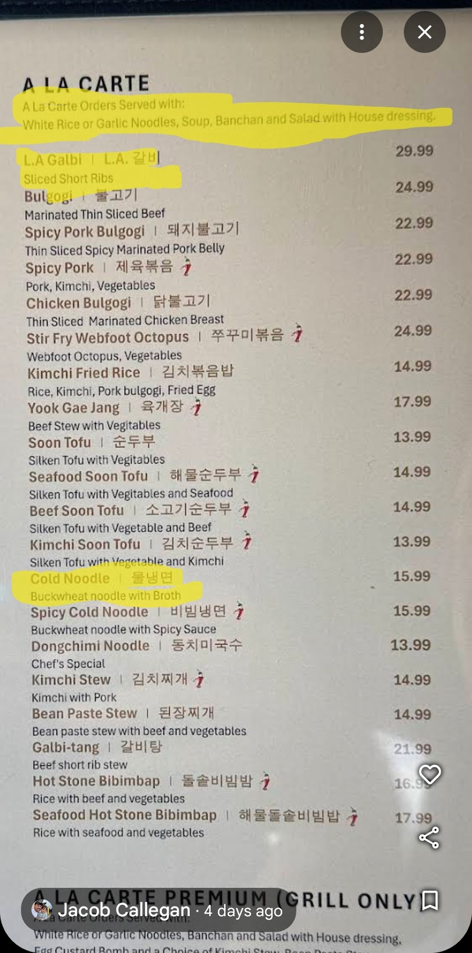 Read moreOne star for our nice, 'new' waitress and some decent food options. First of all, if your menu has typos and mistakes, own up to it and do not blame your mistake on new employees. The owners were so unprofessional, making it a point to come to our table and blame our mis-handled order on the 'new waitress'. Three out of five us could see the highlighted info, if that is not what you offer with each a la carte dish, then your menu should be reprinted and fixed, but instead they blamed it on the new waitress "not knowing" which dish actually comes with those sides. Quality starts from the top down, and if you have owners throwing their new employees under the bus for their own confusing menu and poor training, there is no quality or integrity there. Second of all, the food overall just wasn't good. Perhaps this place caters more towards customers who just want the AYCE option and that's fine. But if you're going to offer a la carte for other customers, I'd expect it to be up to par. The cold noodles were bad, we did not even finish it. The broth was greasy and not refreshing, not like one we've ever had before. The banchan sides were limited and did not taste great. I did make it a point to finish my side soup which they made special since they "honored the mistake" of our waitress, aka their own from their mis-printed menu. The beef tartare and galbi were decent, but not enough to make up for the overall weird vibe the owners and other staff gave me. There are just too many other great options to go back...