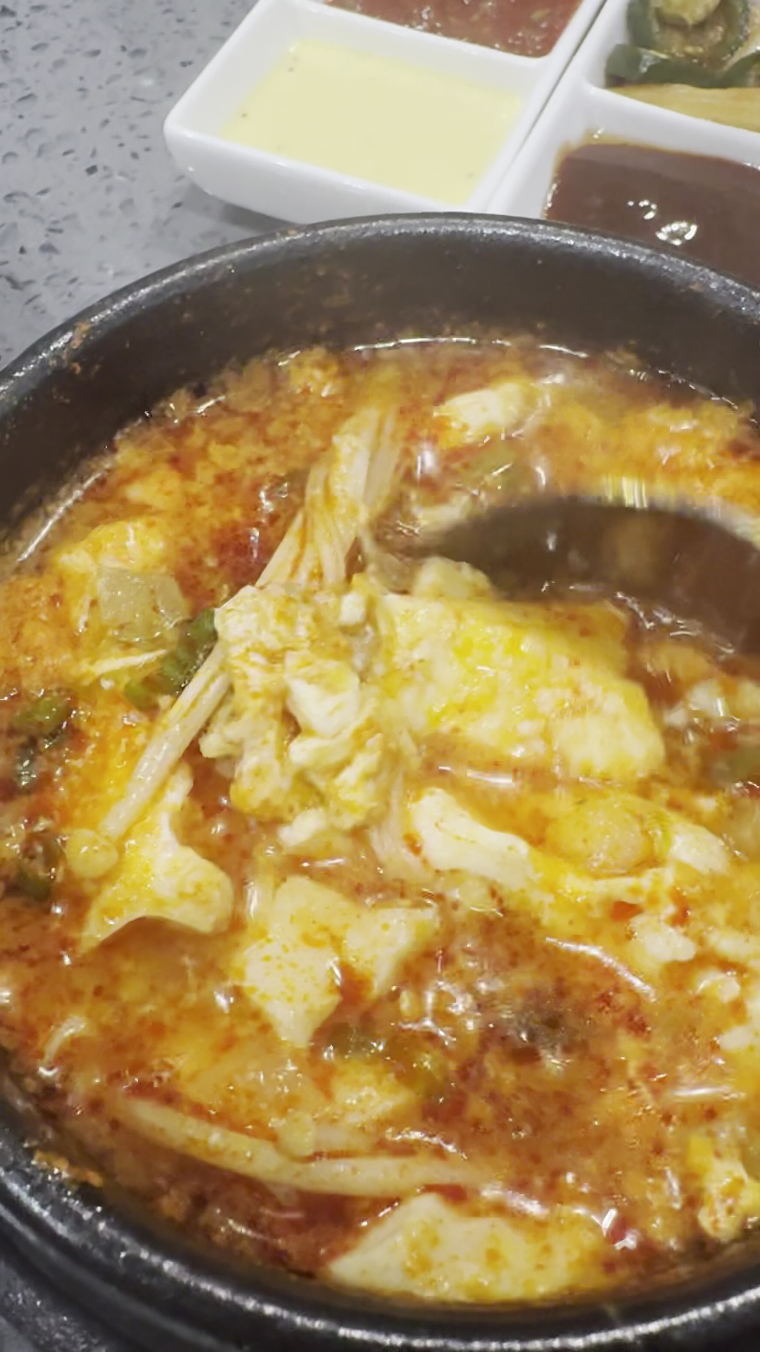 Despite that we had a wonderful experience with our family of seven at this location. the kimchi tasted homemade, and the marinates on the meats also tasted extremely fresh. The high-quality of the beef and the pork was tender after cooking. The octopus and shrimp also tasted fresh and not frozen. The different variety of dipping sauces was nice however all typically focus more on the meats with kimchi and just a little bit of rice. The egg appetizer was delicious and soft and a very nice touch the kimchi stew and the jig also tasted delicious.
