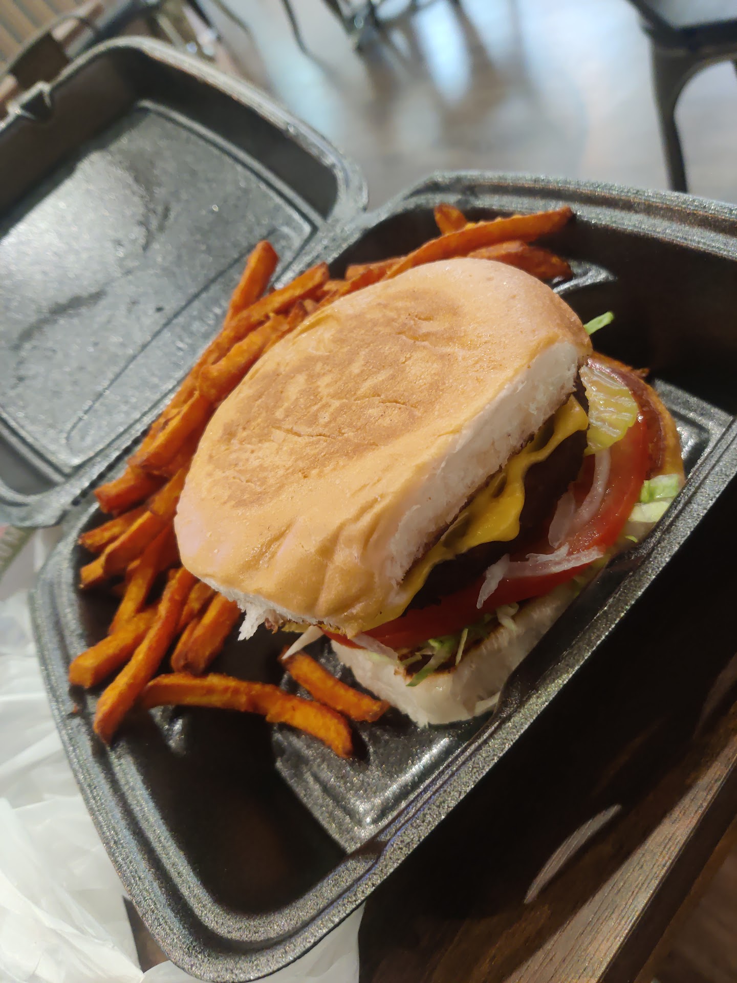 Read moreLove the 80s music while eating. My near favorite veggie burger and sweet potato fries combo. ...
