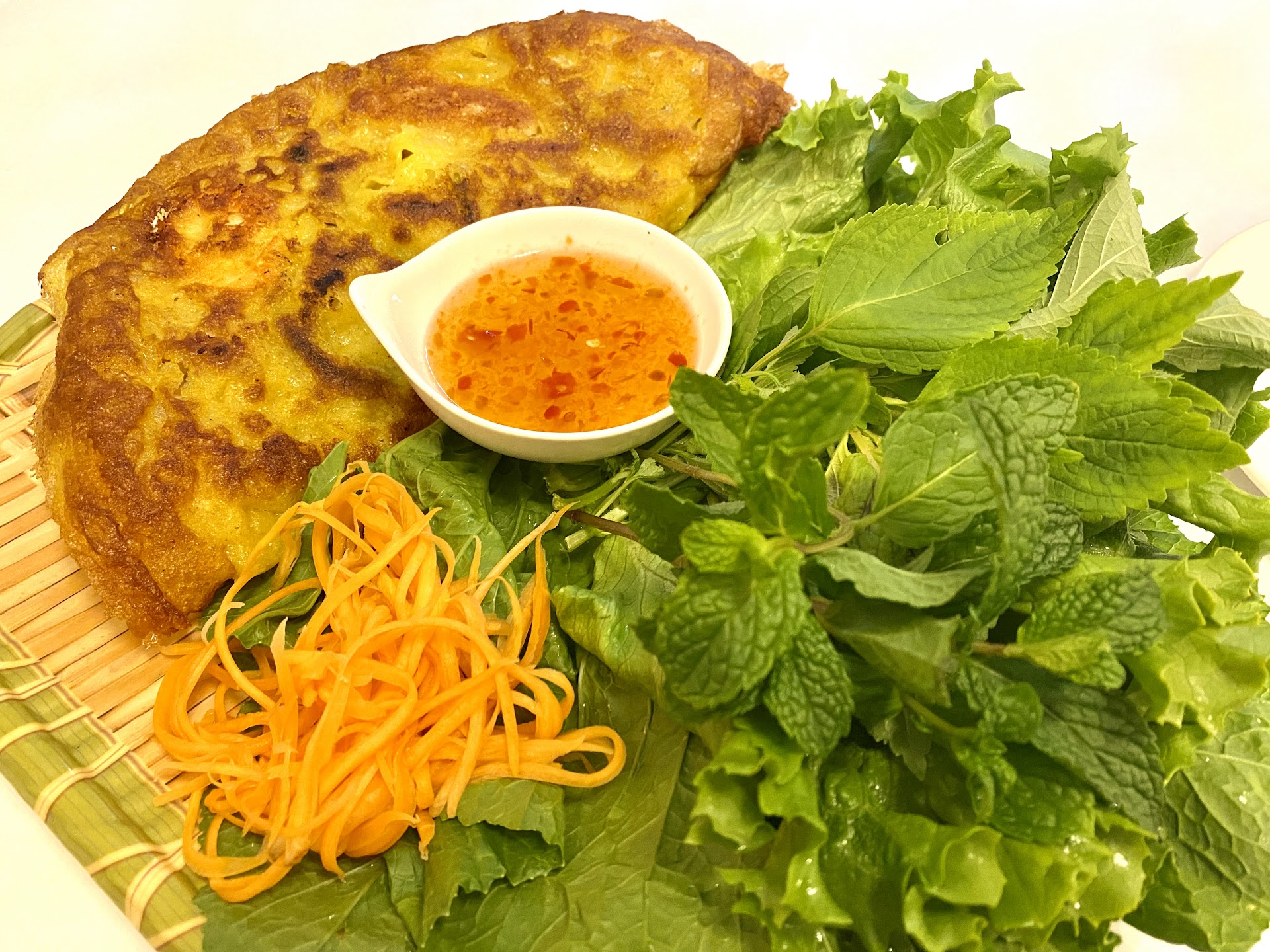 And the greens that come with each crepe are as equally sumptuous: lots of it, and unique. You will get green-leaf lettuce, varieties of different herbs, cheery carrot noodles, and a green leaf wrap that we have not experienced anywhere else: “Lá Cải Xanh.” We don’t know the English translation for this green but it perfectly serves as a wrapper to roll the crepe neatly in, ready to be dipped into fish sauce. Lá Cải Xanh is not easy to break as lettuce, as if the leaf has a built-in anti-breakage additive, and has a distinct slightly spicy taste that adds a “kick” to one’s gastronomic experience.