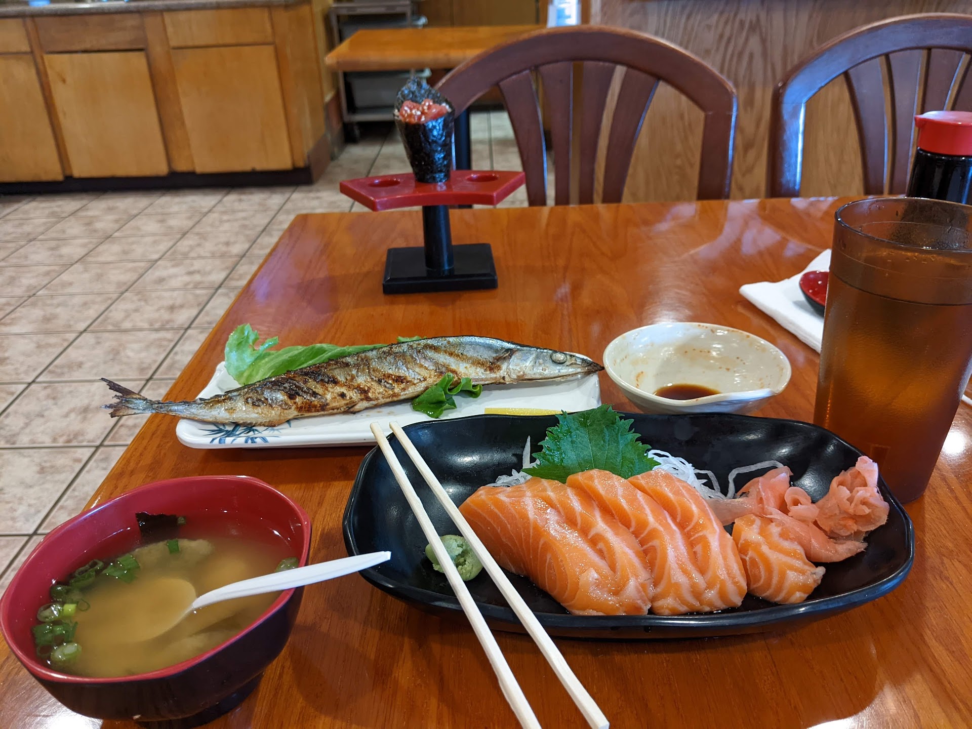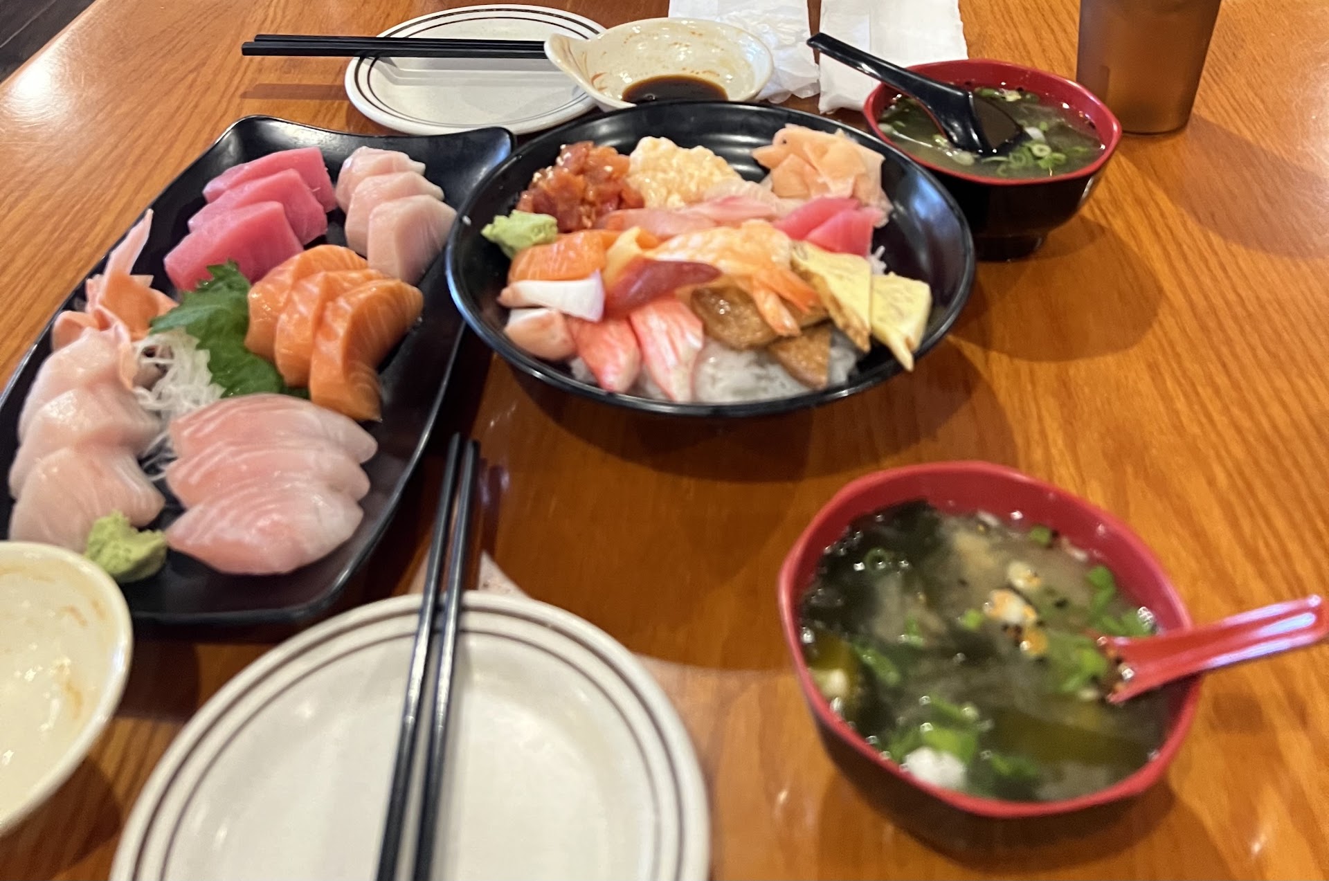 Yes, they have free miso soup and red bean dessert. Free food alone cannot coax a 4/5 star rating out of me. The tasty grilled mackerel was nice, but I must say that raw fish at room temperature makes me a little queasy. You can keep your stale seaweed and questionable fish Hokkaido... I'll keep my money...