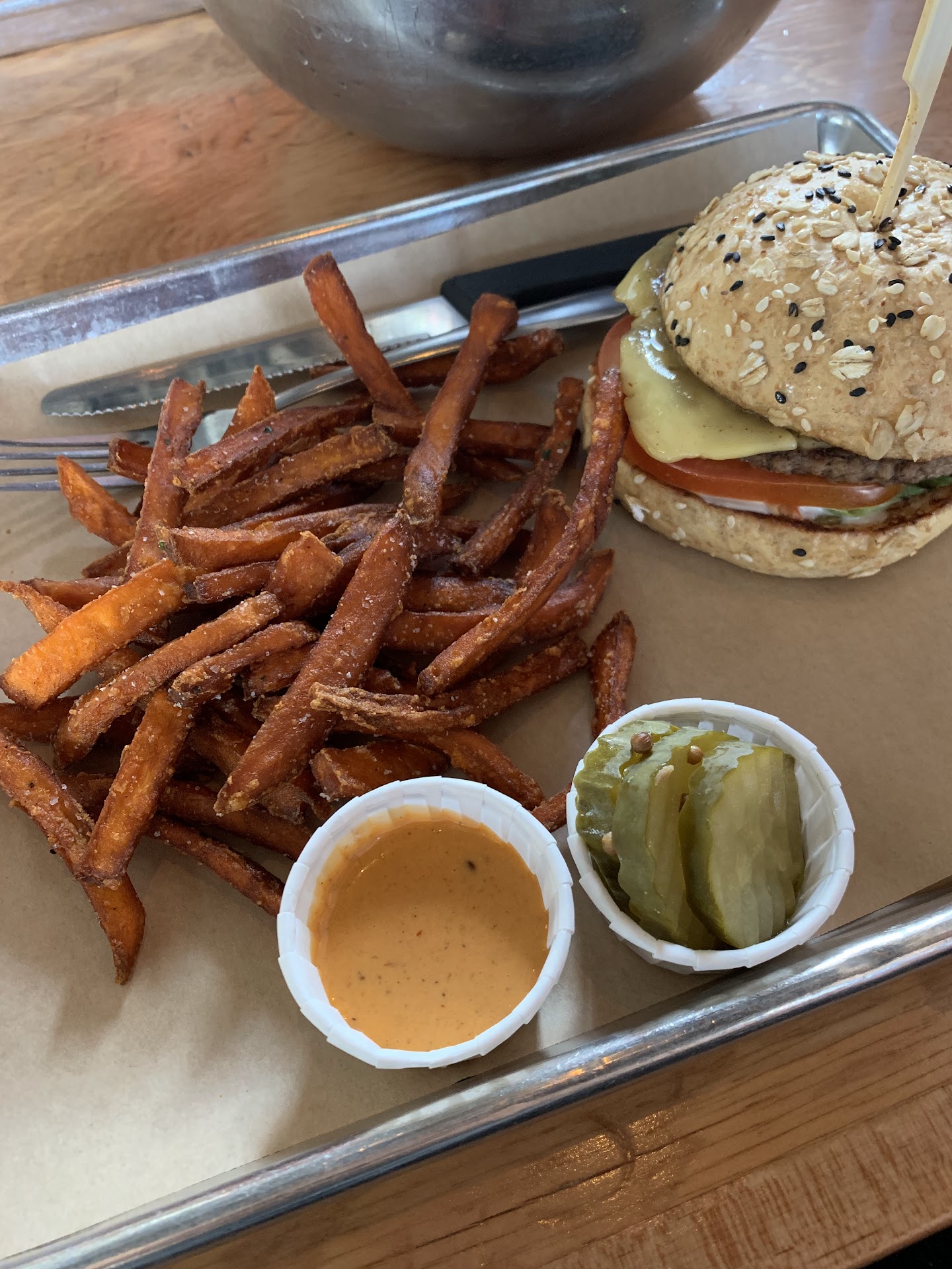 My first experience with Hopdoddy was in Austin, TX and I have yet to find a location that tops theirs. I was thrilled to find out there was a location in The Heights. As a new Vegan, I was disappointed that I couldnāt partake in the queso fries, but the sweet potato fries are always a great option. I was also excited to try the Impossible Burger.