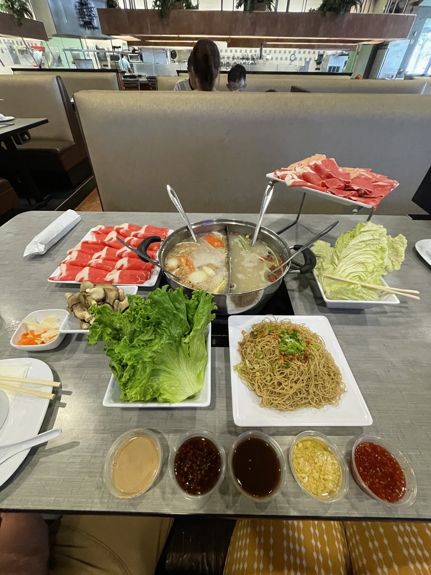 Read moreI can on a Friday lunch and was expecting it to be packed but it was may be a quarter full. At $20 it was an attractive price similar to my favorite hot pot place in Chinatown. It had less meat offerings with only 6 total which includes 2 beef and 1 lamb. Seafood was mussels, squid rings, blue crab and shrimp. There was no clams today. And they had whole small squid which including the whole body. They left the innards and it just tasted gross. There was a cooked section and I really enjoyed the wings. Big selection of vegetables, fruit and desserts which I appreciated. I got the big pot split in half with Tom Yum and Mongolian. The Tom Yum tasted better the more it boiled but the opposite for the Mongolian which I didn’t enjoy as much. Honestly this place should do well but it wasn’t busy. I feel the 2 things missing compared to May favorite hotpot restaurant for the same price is the better options of meat and the quality of the sauces. If they had both I’d be coming...
