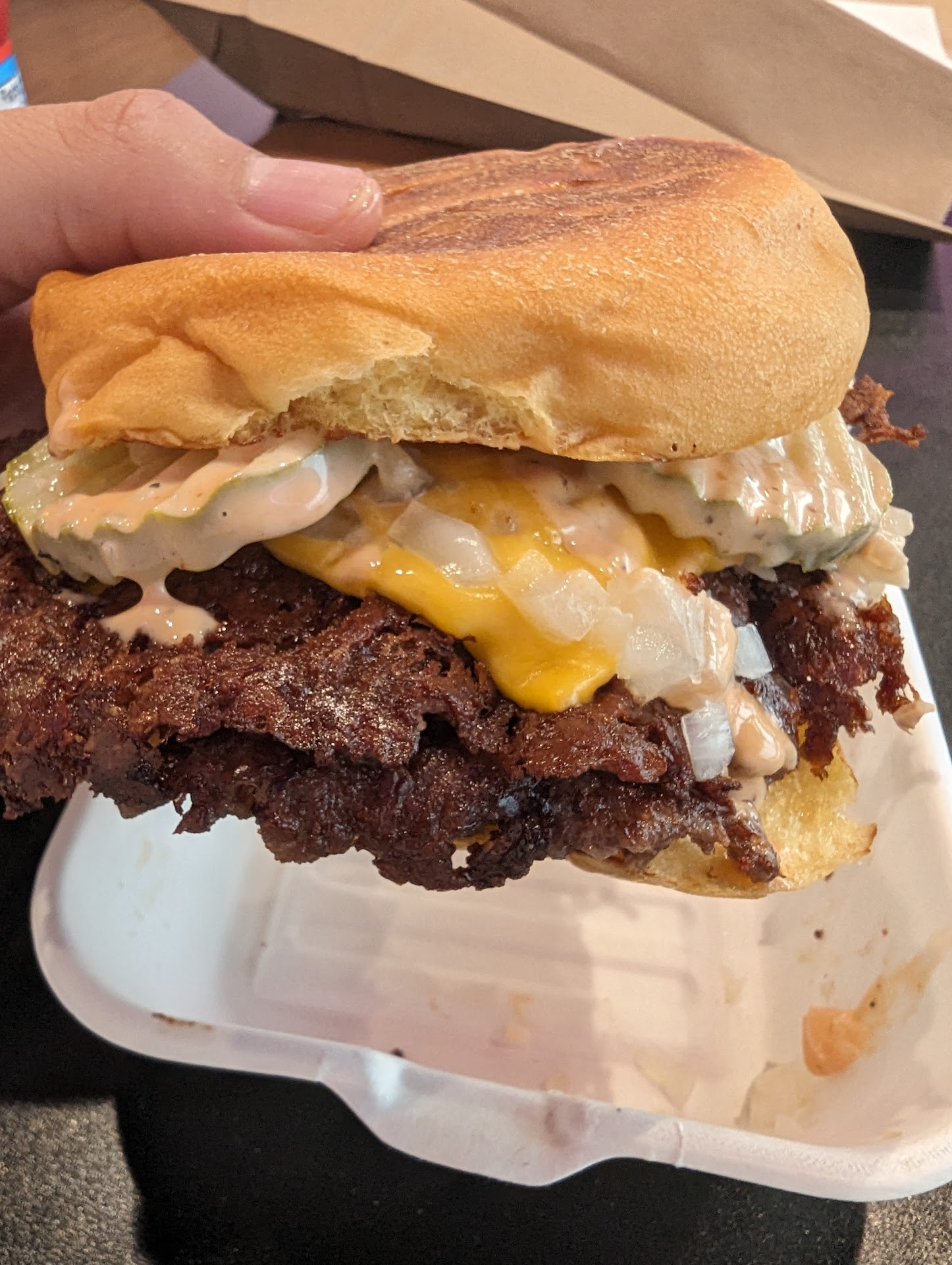 Read moreHotline Bling Burger. I started going there about 3 months ago and ever since then. Anytime I go I end up going another two times that week. Best smashburger in Houston. I repeat the best smash burger in Houston and I ever had.!!! I get the hotline bling burger and a substitute the grilled onions for chopped onions. When you bite into the burger you taste everything. The smack sauce the great quality meat the sliced cheese the onions to the bun. It's light in your mouth. And when you finish it you don't feel overwhelmed. It's the first smashburger in Houston before all the other smashburgers came. And it's the best. I've had all kinds of smash burgers in Houston in this one right here is legit it is the one. If you want to leave satisfied I recommend hotline bling burger. Always hot always fresh. And when I mean hot I mean like your burger is hot like right off the grill. Not lukewarm or anything like that. Hot fresh great ingredients, I recommend everything on the menu. Sometimes you don't even need fries cuz the burger is that good. Self service at the calendar which is always great because you can pick what you want. I went today and they actually upgraded the menu. By adding pictures and you can add and take off or even press light on anything you want. Hotline Bling you guys are the best smash burgers in Houston. And this is coming from a guy that has tried all the smash burgers in Houston. Thank you very much for always the great service and I'll be...