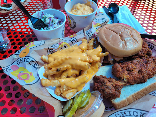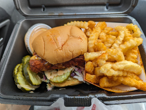 I went here after checking out some glasses at Visionworks. I had ordered them once through a food delivery app but never actually sat inside. The gentleman at the counter took my order and asked if I had ordered here before. I asked him for his suggestion, and he suggested the number 3, which had a chicken sandwich and a tender with fries and a drink. I decided to upgrade my drink to the Rocket Cream (after his recommendation), and I was glad I did! The Rocket Cream was a cool treat for a still surprisingly hot fall day. It also came with a collectible cup (I did not want to keep it this go-around, but it was a great looking cup!). I chose mild for the amount of heat on the chicken and no kale slaw. The pickles were CRISP and had a nice crunch to them! The fries were fried to a perfect crisp and seasoned well! The sauce reminded me a bit of the sauce from Raising Cane's, but it tasted better to me. The tender came on a slice of white bread, so it felt like I almost had two chicken sandwiches! The chicken tender and the chicken used for the sandwich were perfectly seasoned. They were HOT (as in fresh, which was great to taste). I dipped everything into that special sauce (even the pickles!), and it was an absolute delight! The atmosphere was chill. 90s rock and classic rock played over the loudspeakers, and the stools to sit on were small but surprisingly not uncomfortable. I recommend getting there before the lunch rush (lunch rush was around noon, so 11:30 is a good time to order and enjoy your meal if you're sitting inside). I highly recommend going here!