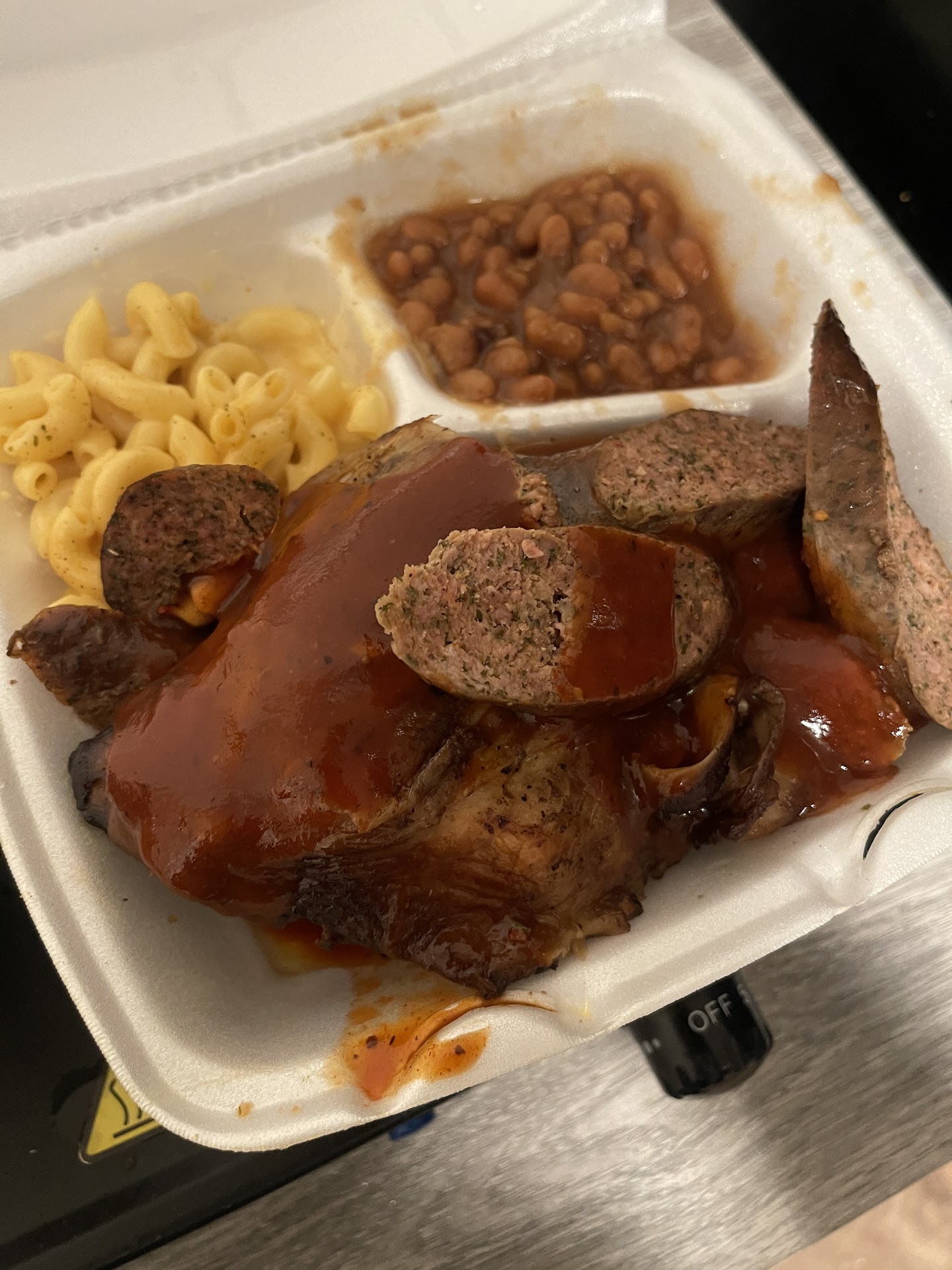 Read moreThe ribs were really dry and tough. I must have caught them on a bad day because the food that day was not good. I remember how barbecue use to actually be smothered in barbecue sauce and it would be everywhere. I ended up adding my own sauce once I got home. I ordered a 3-meat plate (chicken, ribs, sausage) and I got a good amount of food but not $34 worth. The sausage was dry and had a funny taste kinda like a few days old taste; same thing with the mac 'n cheese... tasted slightly spoiled. I didn't like the potato salad either. I felt like the potatoes weren't thoroughly cooked. The beans were about the only thing I did enjoy. Overall not good. I may give them another try but not for a...