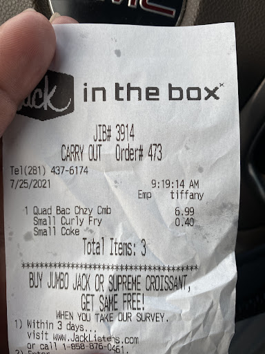 Read moreWhen we first got to the Jack in the Box with no line, we were expecting a quick grab and go with our food. On the contrary, the lady at the window told us to pull up around the front into the parking lot, where we saw 5 other cars smushed into the tiny parking lot. After waiting about 10 minutes, we saw people leave their cars and go inside looking for their food, then come back out to their cars and wait. After another 3 minutes, the lady at the window came out, walking slower than a snail giving out bags of food to cars. After another 5 minutes, we were finally given our food. During those 10 minutes waiting for our food, we saw a "drunk" or "tipsy" man wobble his way into the estate, then leave right after. The service was absolutely horrible, the atmosphere was okay at most, and the food is fine. Not good, great, okay, or...