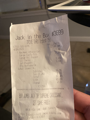 Ā Ā Ā Read moreSo the Jack in the box is at 1217 Wayside Dr. Houston Tx. Oddly enough there was an employee who I couldnāt tell was male or female. I ordered an All American Ribeye Burger combo large and a 3 piece jalapeƱo poppers, 2 regular tacos and a large fries in a large box but it was a small fries in a large box a burger built by a toddler and 4 poppers not 3. I asked for ketchup, I was informed they didnāt have any, I requested hot sauce it give me one. I asked for more and I got pure attitude for 7 more Considering I was ordering a new meal on menu I want the sauce to kill taste if I do not like it. I never got my tacos because I didnāt want to deal with āitsāattitude. ON THE OTHER HAND an AFRICAN AMERICAN man there on grave yards at other times he is AMAZING He is fast and can carry a side conversation with customers in drive thru and put food out ACCURATELY AND HOT. I HOPE HE get promoted before a better company...