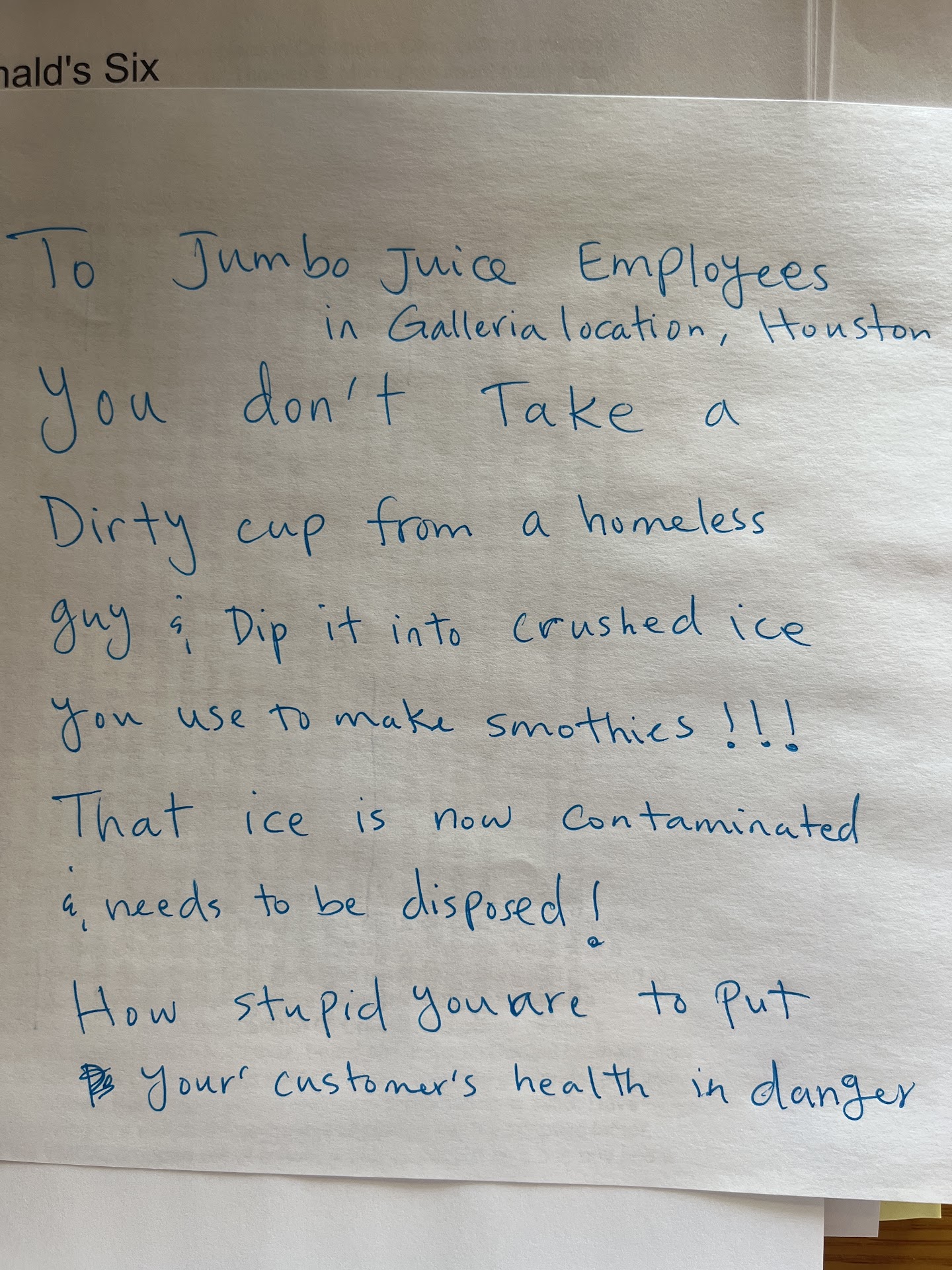 Ā Ā Ā Read moreI witnessed this yesterday: the manager took a dirty cup from a homeless guy who walked in and demanded ice! she dipped the dirty cup in the crushed ice they use to make smoothies and handed back to him!!!!!! they have a ladle to scoop ice to make smoothies but she DIPPED THE ENTIRE 20 oz CUP FROM A HOMELESS GUY IN THE ICE! when I confronted her and the other employees she responded do you want to call corporate???? I said I want you to accept the mistake you made and dispose all that ice and sanitize your hands! she ignored and continued her routine making drinks for the other customers and used the SAME ICE! I honestly think she was on something and was high! I asked her name and they all refused to respond kinda like they were afraid of her. Anyone in food business take a food handheld course and should know how important it is handling ICE. This happened Sunday Oct 9 around 4 pm. Please someone from Jumbo juice take this seriously! she should not be working in food business and be the...