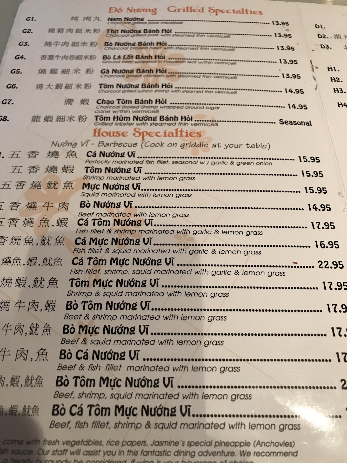 Read moreThe 7 course beef is their specialty and it tasted the same as 30 years ago. In fact, the original couple from Saigon Pagolac splitted and opened this restaurant. The beef courses as I said, tasted exactly the same while Saigon Pagolac changed for the worse. Their meat quality was tough and chewy. As for the number of waiters Jasmine is worse than Saigon Pagolac. Only one waiter walking around taking orders for all tables. Our water didn't get refilled we had to wave him over. He did stop by later and asked what we needed but then we were done. Since my brother insisted to pay, we let him, but later found out the bill was over $200 plus he gave $30 tips. That's way too much when added up with the dishes we ordered for 6 of us. We got overcharged big time. The live music gave it a nice atmosphere. Don't know if they jacked up the prices to pay these musicians. Watch your bill and pull out your phone's calculator! Two stars for overpriced. Besides the 7-course dishes, any other dishes such as salted pepper fried squid, soft lomein (cheap noodles, not the real thin noodles and bland taste), fried oysters with ginger & green onions are just mediocre and subpar. In the noodle dish there is a batch of meat pieces that was cut but never separated from each other. That's either an inattentive chef or the cook's helpers. This is a 2 star restaurant at best, unless you're there to slowly chew on your 7 course meat while listening to live music, then you can add another star to...