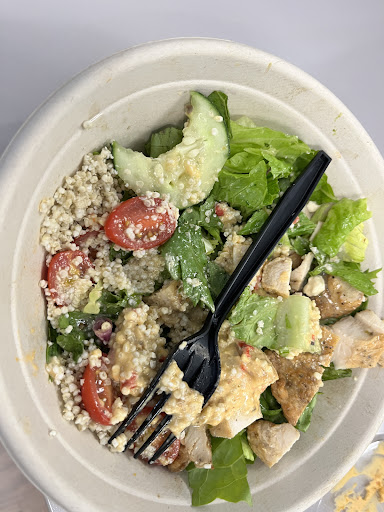 Lighter options include the Mediterranean Wrap with a side of fruit. Under 500 calories I believe, for a really tasty meal that will get you through the afternoon.