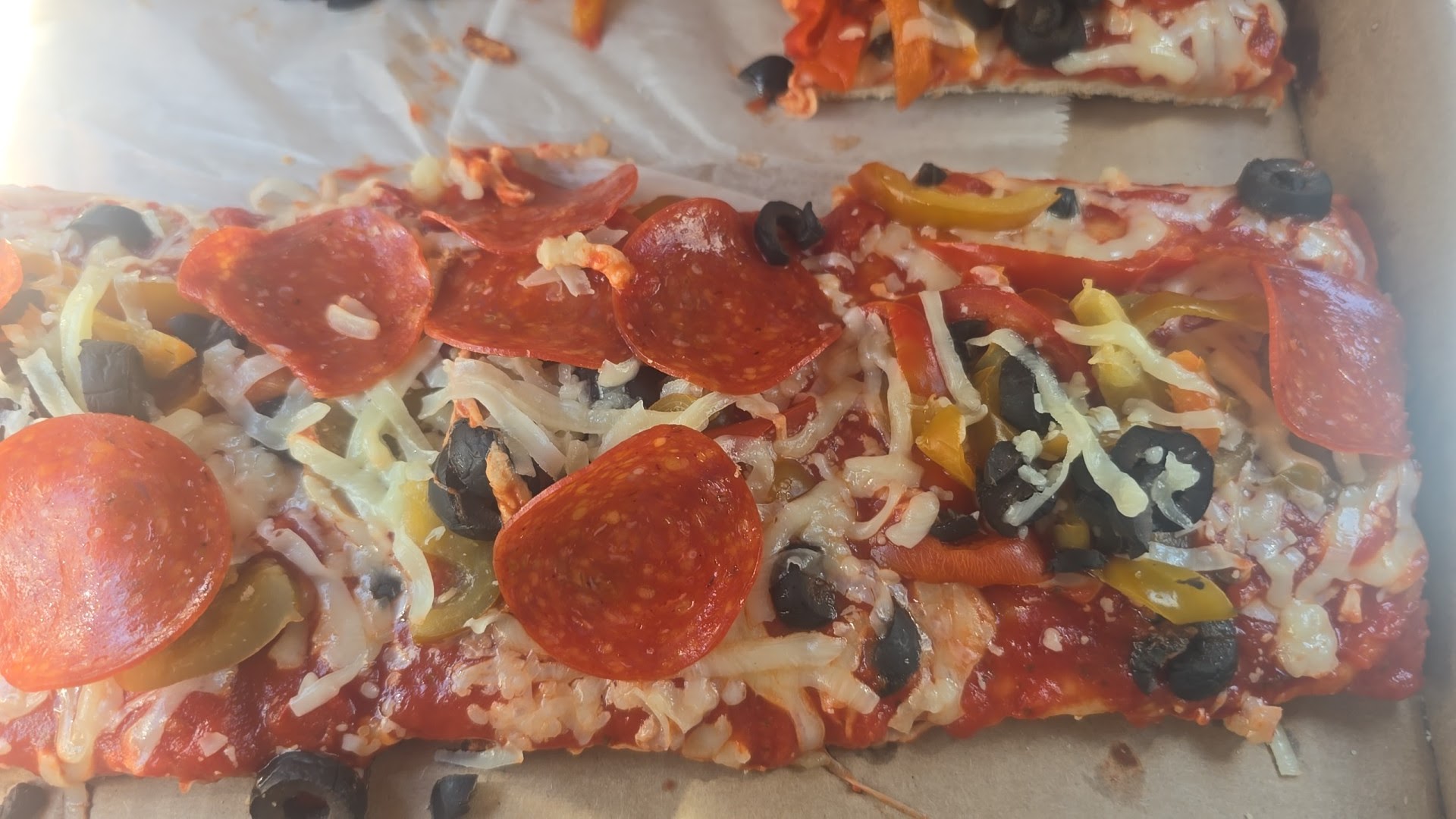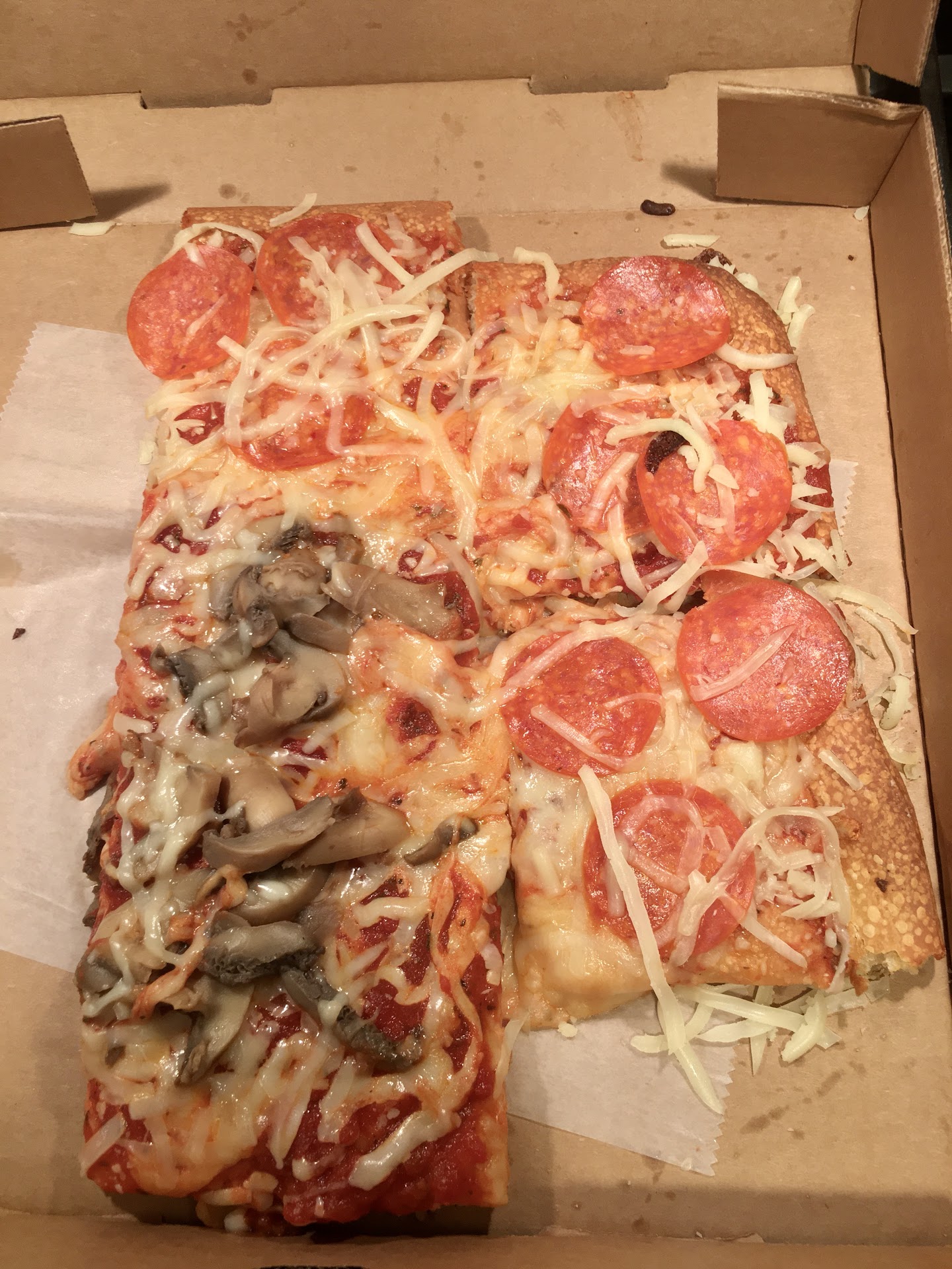 The toppings I sampled were pepperoni and mushroom. The mushroom was obviously canned and was cold on top of the slices. The pepperoni was your average deli style and of lower quality.