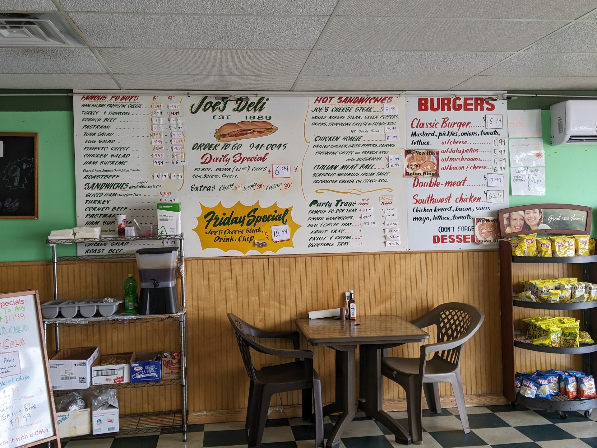 Hmm, I really wanted to rate this higher, but they got my to-go order wrong. I placed my order at the counter - a classic burger - mayo instead of mustard, no pickles - and an order of fries. The cashier was super nice, conversing with me about the $1 coin I used to pay for my order. I got my order in about 10 min, looked in bag and noticed fries were missing. I reminded the cashier and he told the cooks in the back. Didn't take too long to give it to me, since they had just finished frying a new batch. So I got to my destination 5 min. after I left Joe's, opened my burger wrapper - the bread was crumbly and just looked old. Worse, I saw mustard on the bottom bun!! ACK! Can't stand mustard on burgers. I started to eat anyway, as hungry as I was, and ACK again, I bit into a pickle!!! Augh!!!! I just pulled all the pickles out everytime I saw one after each bite. How did they get my order wrong? I know it was my order because the cashier read off the order written on the bag - classic burger, no pickles, mayo not mustard. Good thing was that the patty was not greasy. Fries were crinkle-cut fried just how I like them (no burnt or dark brown crispy edges but crispy outside, soft inside). I would love to give this place a better rating because of the four and a half stars it got from others. I am willing to come back and try the burger again (when made exactly to my request). Until then, two...