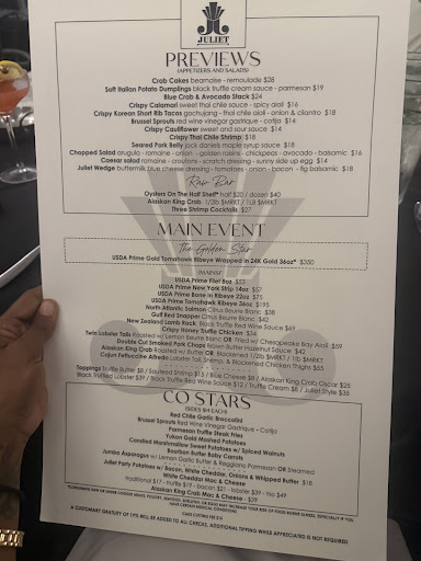 Read more⭐️⭐️⭐️⭐️⭐️ (10/5 if I could!) If you're looking for a place in Houston that effortlessly marries luxury, ambiance, and unforgettable flavor — let me introduce you to Juliet. From the moment I walked through the doors, it was clear this wasn't just dinner — it was an experience. Tucked into the city like a hidden gem, Juliet is a chic, speakeasy-style steakhouse that offers so much more than a good meal. It’s a whole vibe. Think sultry lighting, live music drifting through the air, and décor that makes you feel like you’ve stepped into a cinematic dream. Even the bathroom is a photo-worthy moment — no, seriously. It’s not just a restroom, it’s a design statement. We came to celebrate an engagement with a party of 17 (no small feat for any restaurant), and Juliet handled it with absolute grace. The service? Impeccable. Our server — Elgin, if I recall correctly — was the epitome of professionalism and warmth. He was attentive, charming, and had a genuine kindness that elevated the evening. His personal touch — sharing that he, too, was recently engaged — only deepened the celebratory atmosphere. Now let’s talk about the food, because every dish was a showstopper. We indulged in: Creamy, rich Bacon Mac and Cheese Perfectly seasoned Thai Shrimp with just the right touch of heat Crispy, flavorful Brussels Sprouts Sweet Potato Casserole with Marshmallows (I’ll admit — I’m not a marshmallow fan, but even this dish nearly converted me) Succulent, tender Lamb Chops Silky Fettuccini that melts in your mouth And let’s not forget the desserts — the Caramelized Banana masterpiece and warm, decadent Bread Pudding that I’m still dreaming about Everything was flawless. The timing, the presentation, the temperature — no detail was overlooked. Juliet now holds a top spot on my list for all-around excellence of quality service and food. Who is Juliet for? It’s perfect for a romantic date night, an elegant proposal, a celebration with friends, or a memorable night out while visiting Houston. Quite simply, if you enjoy being treated like royalty, savoring exquisite flavors, and basking in an atmosphere that feels both luxurious and welcoming — this is your place. Juliet is more than a restaurant. It’s a love letter to fine dining, ambiance, and southern hospitality wrapped in style and soul. Don’t just take my word for it — go experience it...