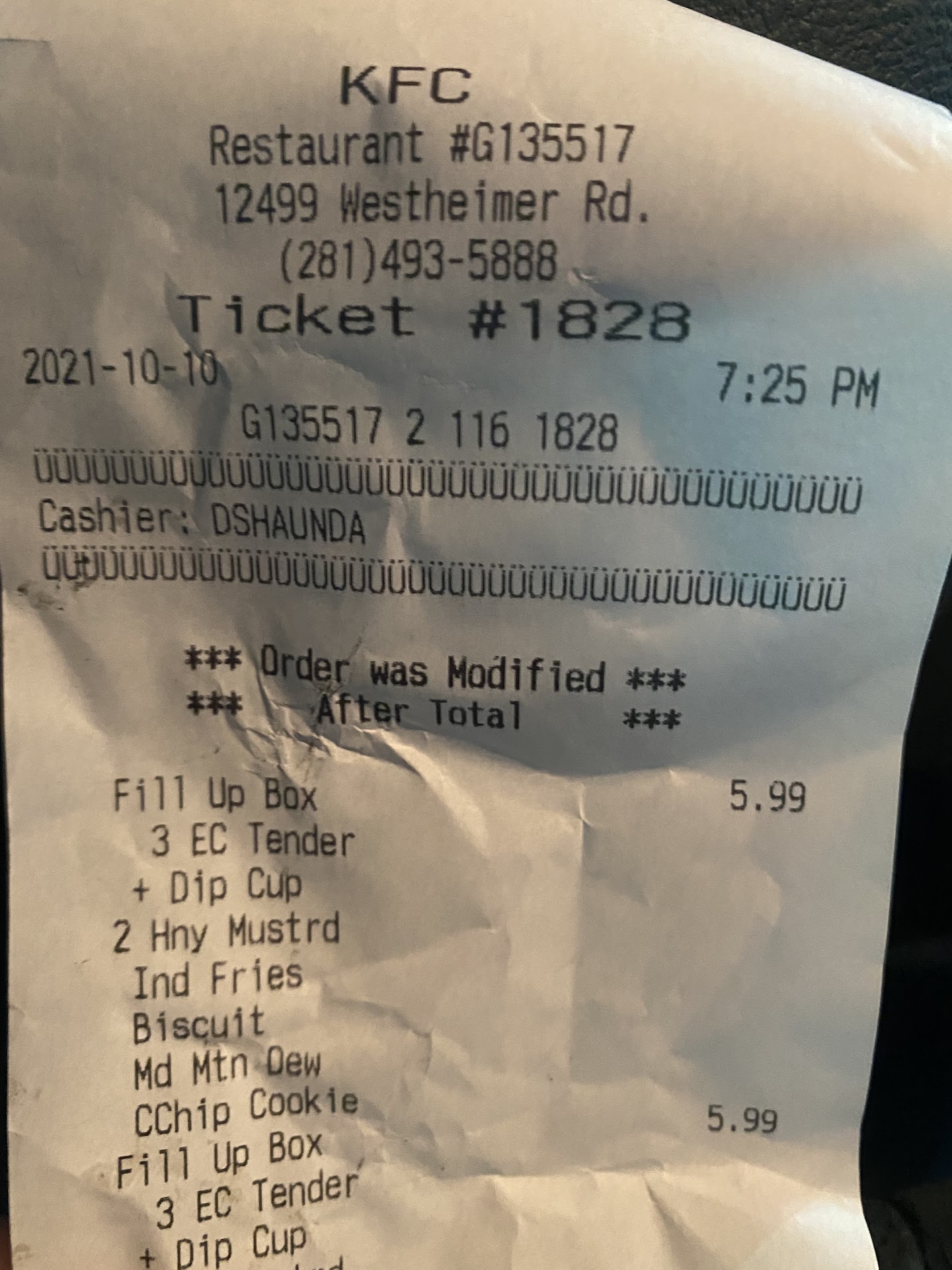 Read moreI ordered the Honey Bbq wings 12 count. I asked the lady were the wings hot and fresh because of my last experience they were not. She said, "yes," and I proceeded to pay. I drove around and check my food before leaving. The container was cold, and the wings look old, and it looked as though they just put the sauce on top. I then went into the building and said that this order was not fresh nor hot. The lady then said to give her 10 minutes, and they will be. So I waited. The manager came out and gave me the order. This time the wongs were burnt and old with new sauce on top. I touched one wing and told her it was scorched. She stated, " well, they are fresh." I told her that the wings were not fresh and that it looks like they warmed them in a microwave or put in the oven at the broil setting. She let me know that there wasn't a microwave in the store. I assured her that fresh wings would not look nor smell like that. I got fed up and requested a refund. I was lied to twice for the lady in the drive-through and the manager. This happened at 12/18/19 between 12 pm and 12:11 pm. There wasn't even an aroma of food being cooked. I won't ever order from here again. I don't give you my money to lie to me and give me old food. Plus, your attitude needs work,...