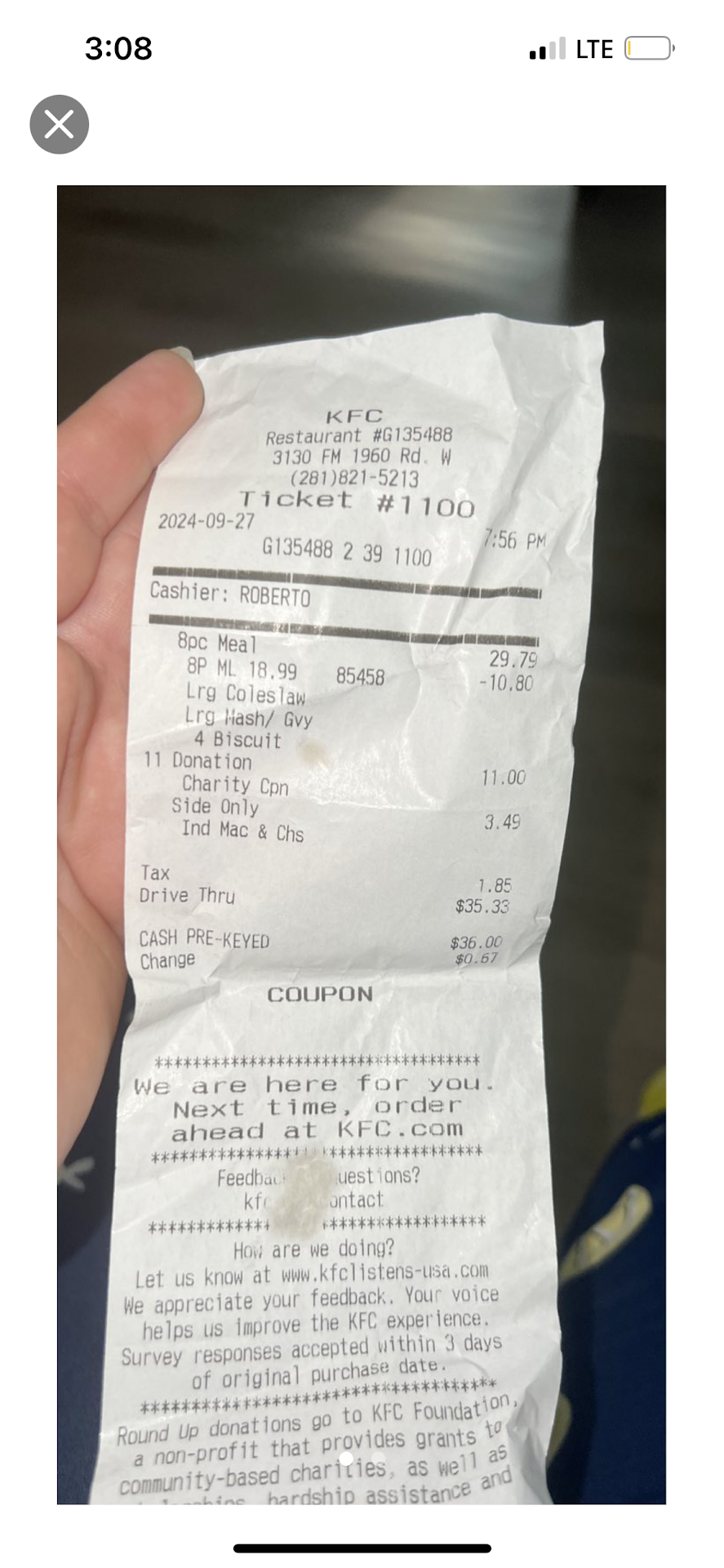Read moreI was told the food was okay. The service my dad received two weeks ago was horrible. Let me not forget to mention this has happened twice. (SMH) The KFC team at 3130 FM 1960, Humble, TX 77338 decided to give him 8 pieces of chicken instead of the 12 pieces ordered. We spoke with a Hispanic dude who was the manager on-site at the time. His appearance was really nasty looking which turned me off from the food all together but my dad had just drove a while to get KFC for my mom. When we got home, the kids ate first which left my mom without. The manager offered to give us the four pieces of chicken because after all, our meal was only short four pieces of chicken. I explained to him the inconvenience of driving back to their store and he seemed to not care. He did not let up on giving out anything extra for the inconvenience. I asked for the store's area manager contact in formation and I reached out but she did not answer nor call back. Her name is Crystal, if you are ever having an issue with this store. Not sure if she would be much help. All KFC's need to be shut down anyway. That's just my opinion... And with service like this, they will be. Keep doing what your...