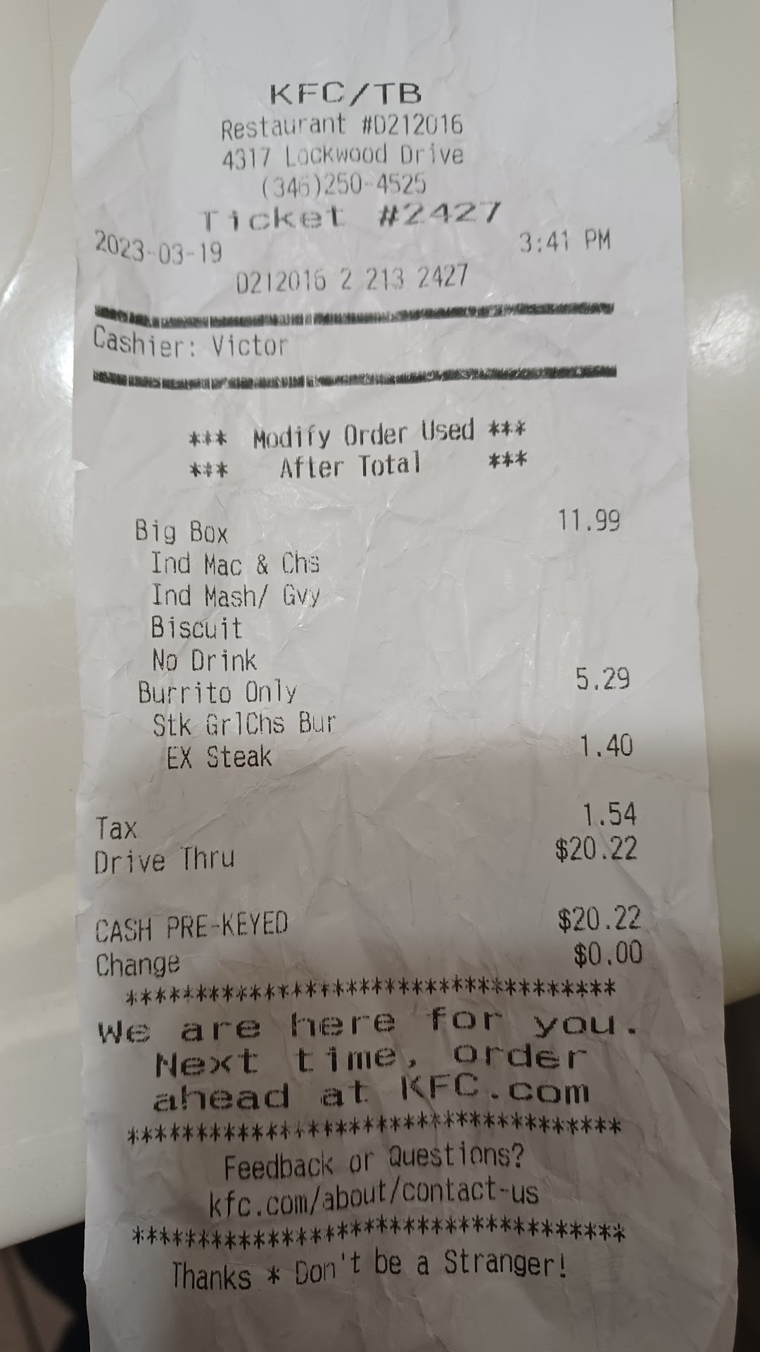 On this day 10/04/2024 I visited the KFC Restaurant on 8787 Tidwell Rd, Houston, TX 77028 The drive thru clerk Anisa or Aniza was a grand stewardess. She is of high frequency and vibration. She made an imprint within my visit there today. It was something to experience. Pleasant would not validate the exchange of authentic energy Anisa was found to be in. She lead with ownership and a hospitality we any consumer returning wants and needs. She would be the first familiar face I would want to greet me. She deserves a promotion or some form of recognition for the demonstration of leadership qualities and what it truly means to be GRAND!!! I don't usually tale out time to survey services I paid for, but Anisa gave me every to do so. I am pretty sure she went above her duties. She gave forefront energy that consumers in this day and age is certain to need. She was grand. She was original. She is of reason. KFC you guys enjoy with gratitude het employment there because Anisa isn't just an initiative, Anisa is an initiator....