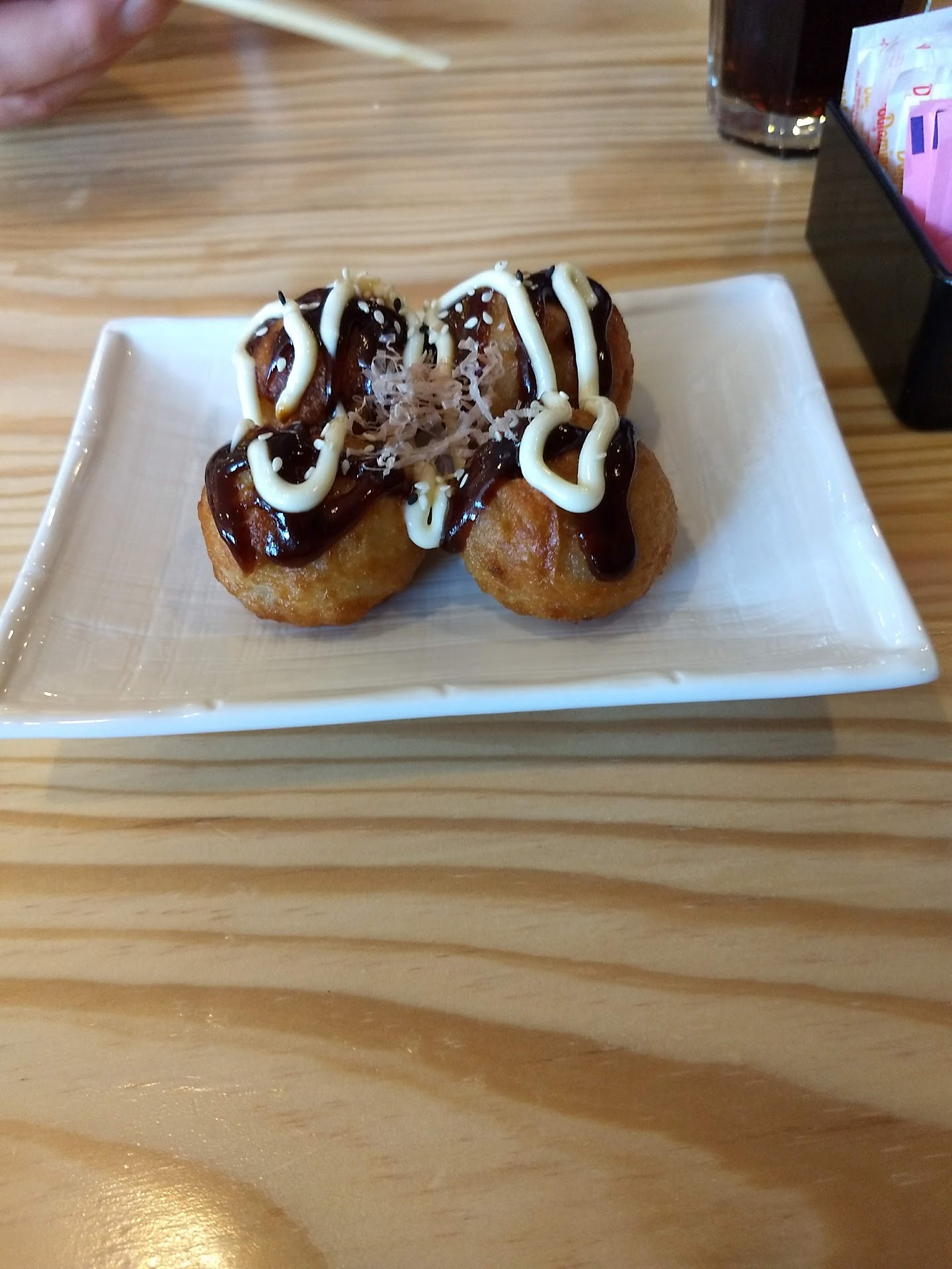 Our appetizer of the takoyaki balls came out first and that was tasty. Then, our son's modified roll came out. The waitress brought it out and was about to set it down, when she noticed it was just seaweed wrap, rice, cucumber, and avocado with no cheese. She apologized and went back to correct it. No biggie.