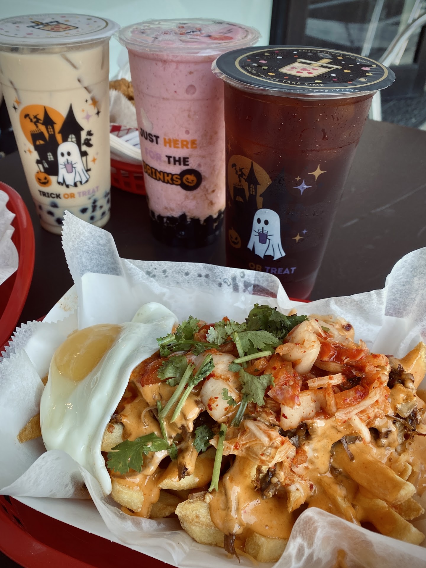 Ā Ā Ā Read moreKravin is a Houston staple for its drinks and fries. We ordered the Kravin fries with beef and bacon the addition of egg is $1. We also ordered the popcorn chicken a mangonada and strawberry lemonade with boba which is carbonated. The fries were nice and crispy while still being a bit fluffy on the inside, bacon and beef were flavorful and goes very well together with the sauce and cilantro. Also has some onion. The sauce is sweet and spicy and a bit tangy. Definitely a good spot to study too the staff is...