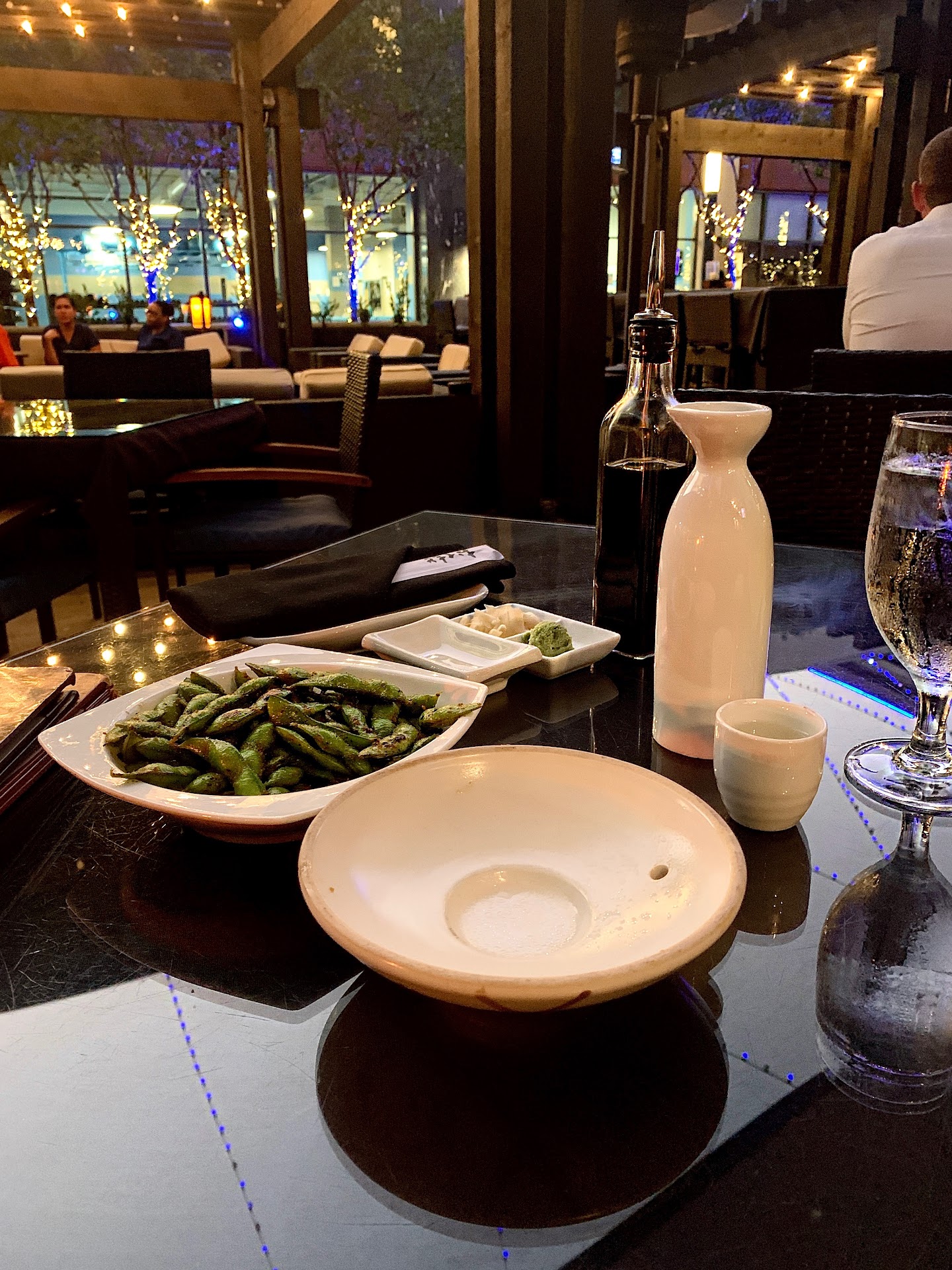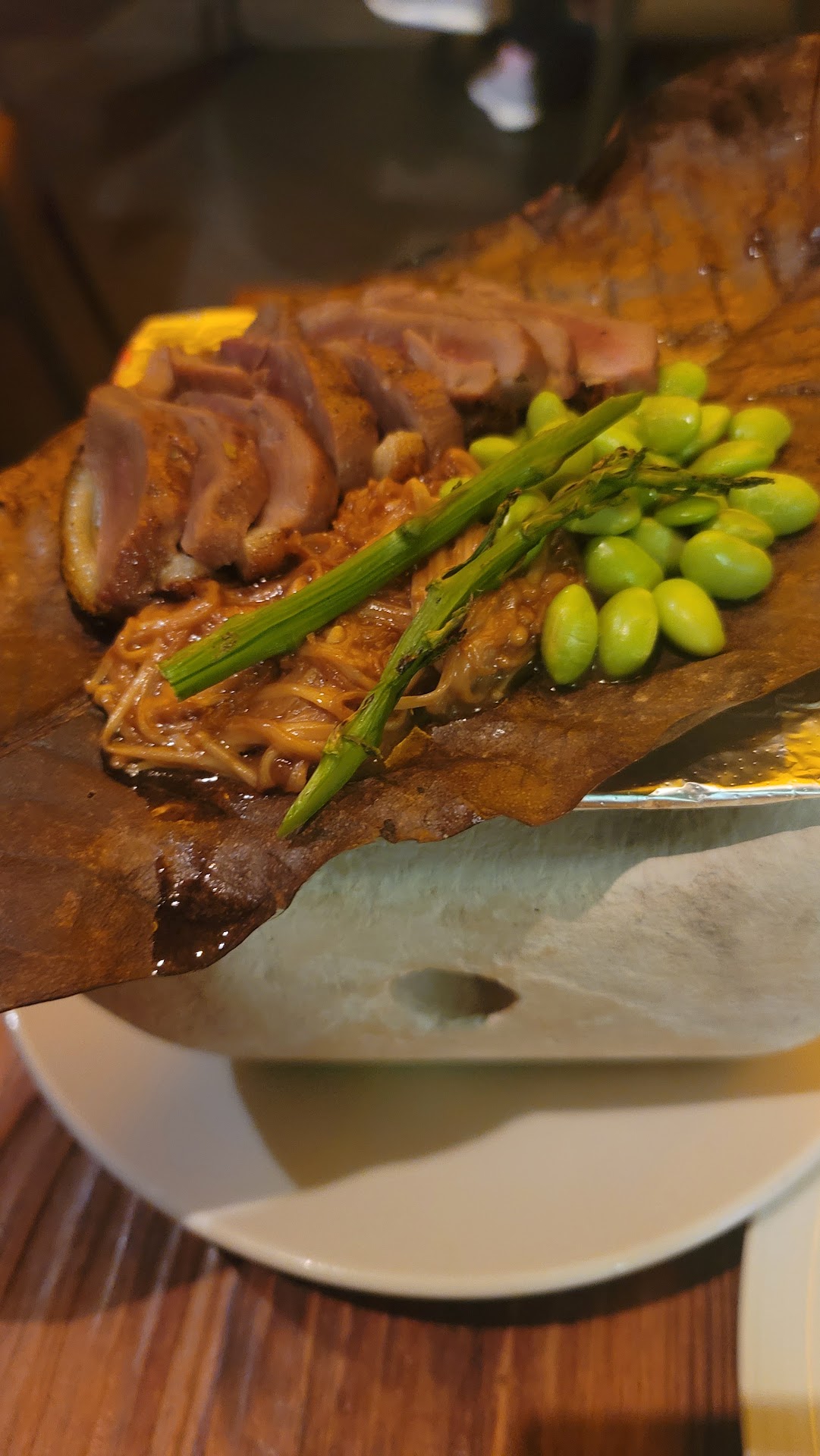 I started out with some pan seared garlic edamame with my sake. One night I got the Seared Peppered Salmon salad with edamame dressing. It was delicious and just the right portion! Both evenings, I got the Rin sushi roll. It has a tempura fried shrimp surrounded by sushi rice with a little cream cheese and avocado inside, then rolled with nori and topped with a spicy aioli and thin slivers of pepper on the top of each slice. Dipped partially into soy sauce, it was just the right combination of spicy, salty, and savory. The nigiri I tried was the akaushi & quail egg (seared thin slice of wagyu beef & over medium quail egg). The flavor was good, however I wasn't as big a fan of the chewy texture of the more raw beef. The sake toro (salmon belly, yuzu kosho, & ikura) was delicious, and the Kani (snow crab). My particular favorites were the ikura (salmon roe) & yuzu tobiko (yuzu flying fish roe). The salmon roe was savory and mild in taste, and the yuzu roe was crunchy, salty, & savory.