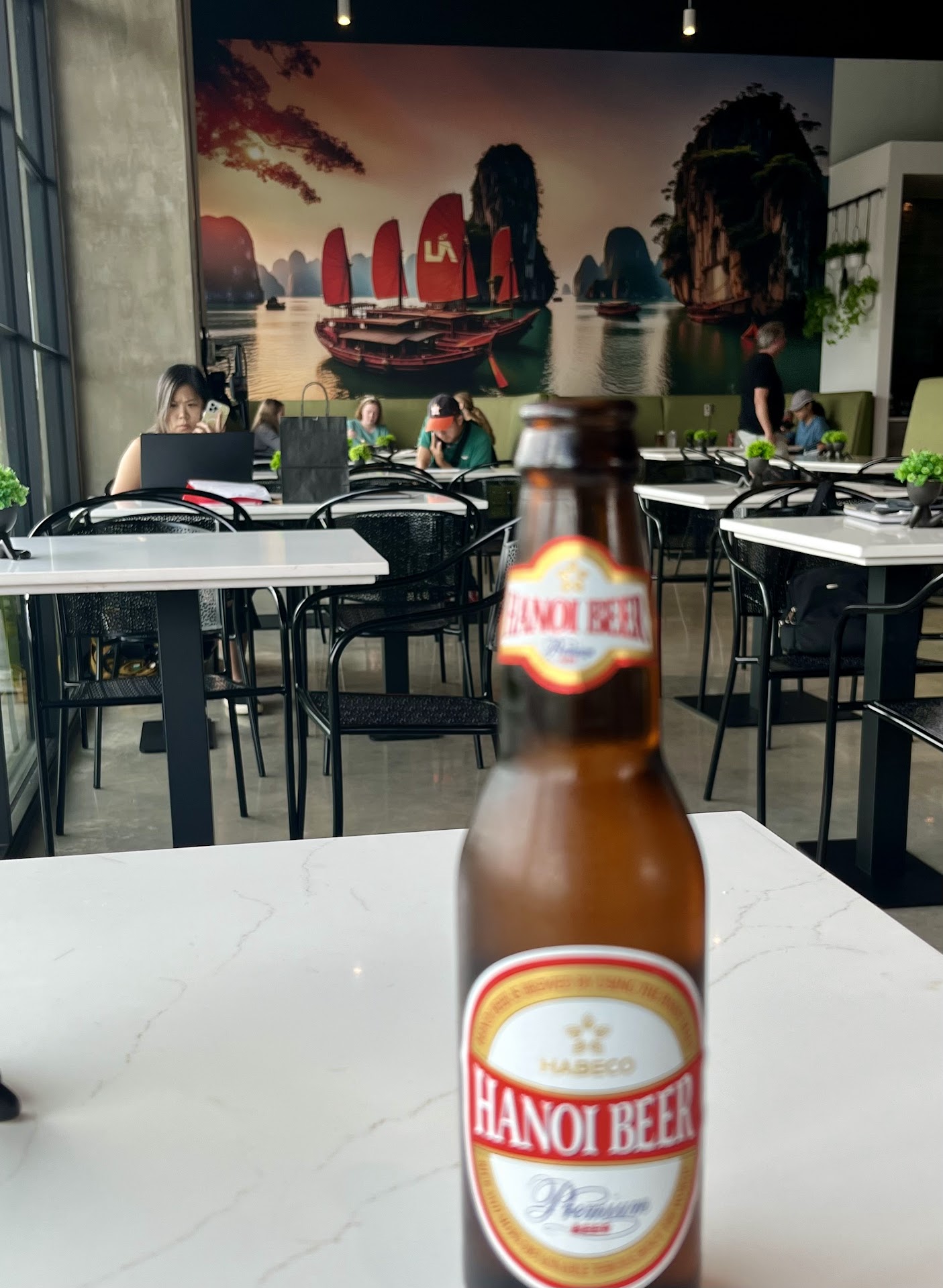 I was also surprised at the minor delay that I experienced in having my food prepared and delivered to my table. In most Vietnamese restaurants the food is served to you within 10 minutes of your order. Despite the restaurant not being busy, it took over 15 minutes to receive my food. The atmosphere of the restaurant is open and inviting with plenty of tables and a pleasant large mural of an Asian boat at the far end. There is also outdoor seating for when the weather is nice, however, the view across the street (Durham) is a a lot full of cars for an auto dealership. The prices were what you expect these days. My pork rolls, pho, a Vietnamese beer, and a tip ran...