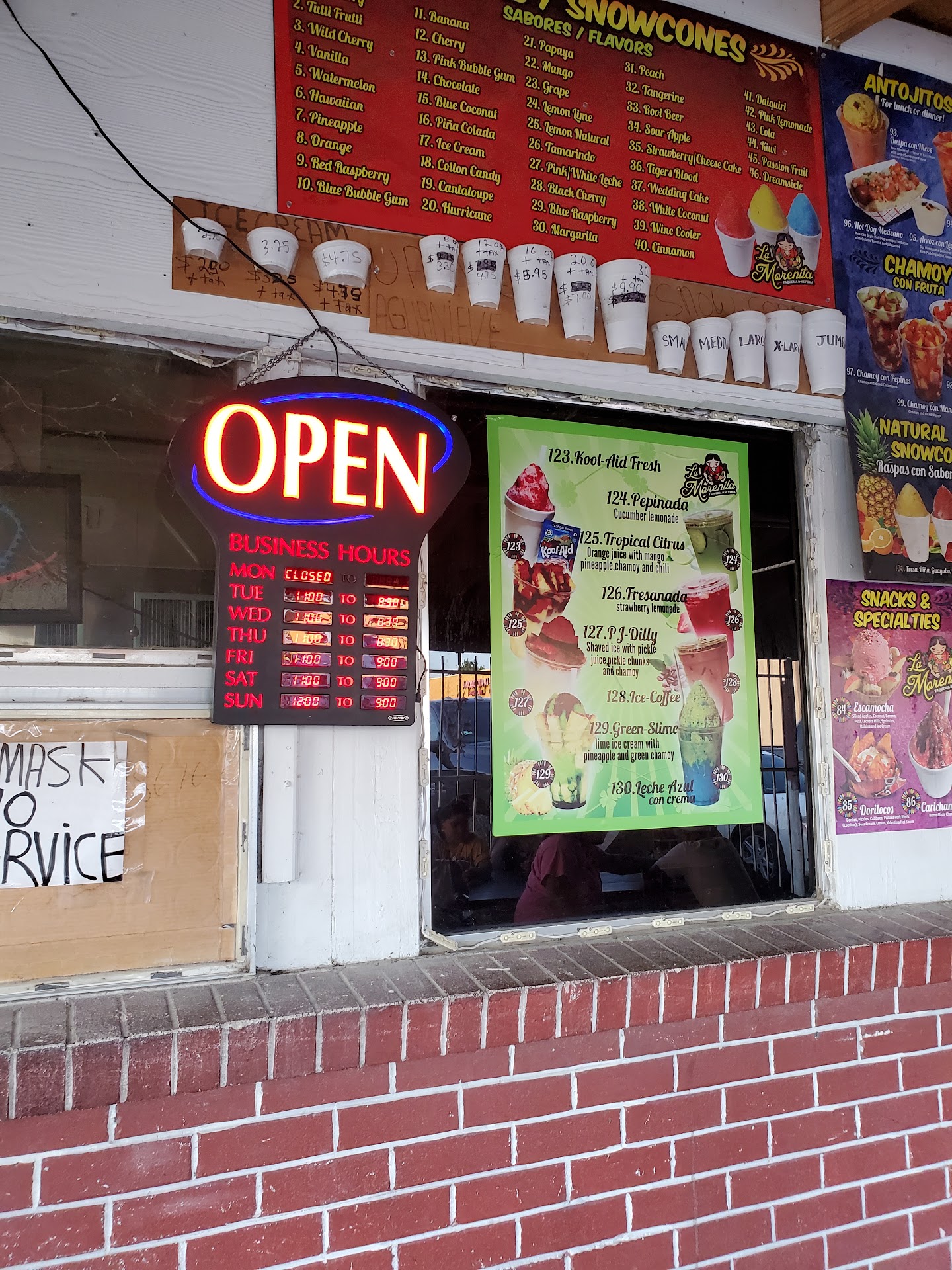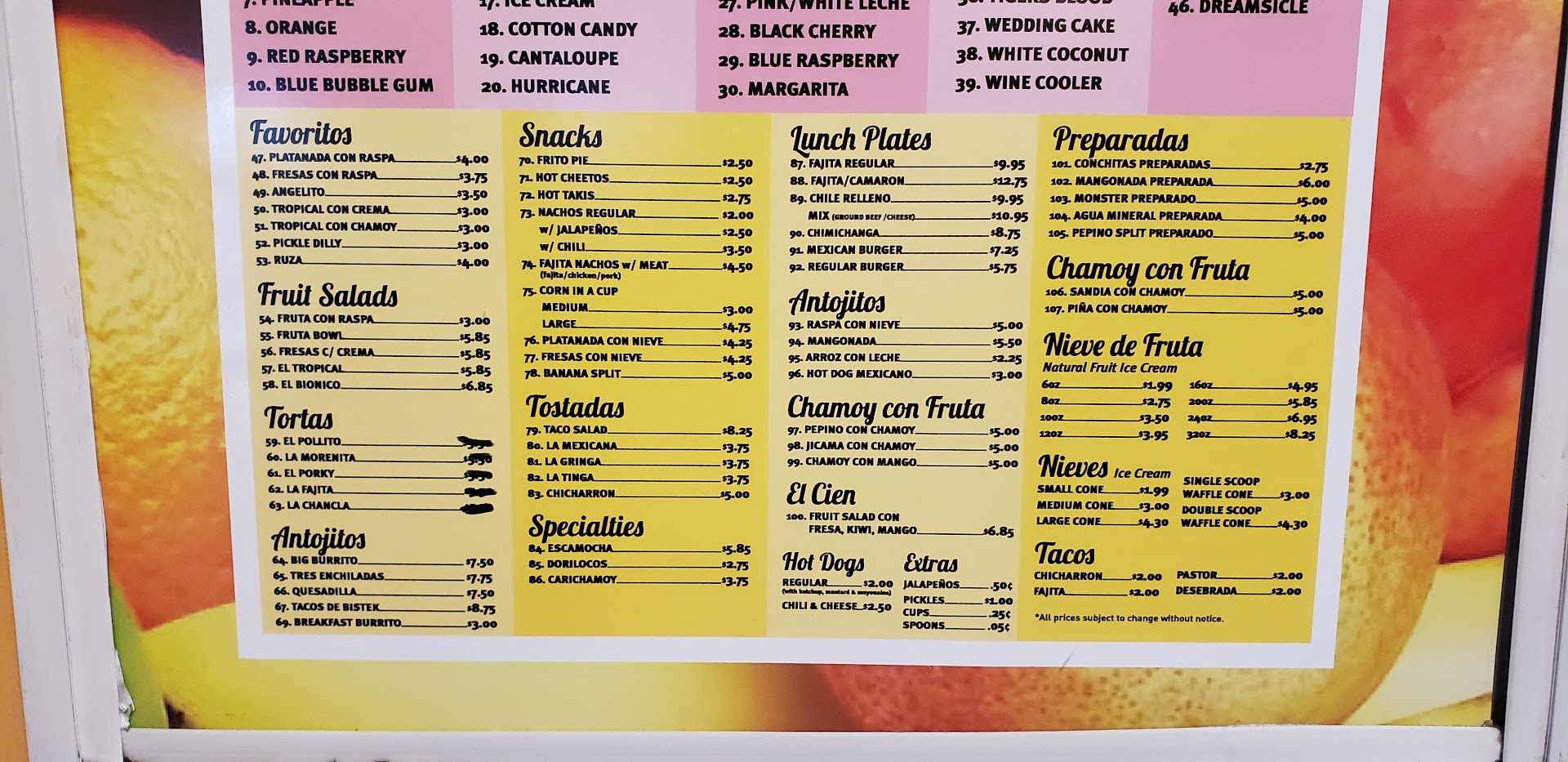 First time coming to this place. I ordered the raspa with Tamarindo and leche. Both super good. Service was fast. Will be back to order more items and check them out. Usually I go to Tampico's but didnt want to drive far today. Good customer...