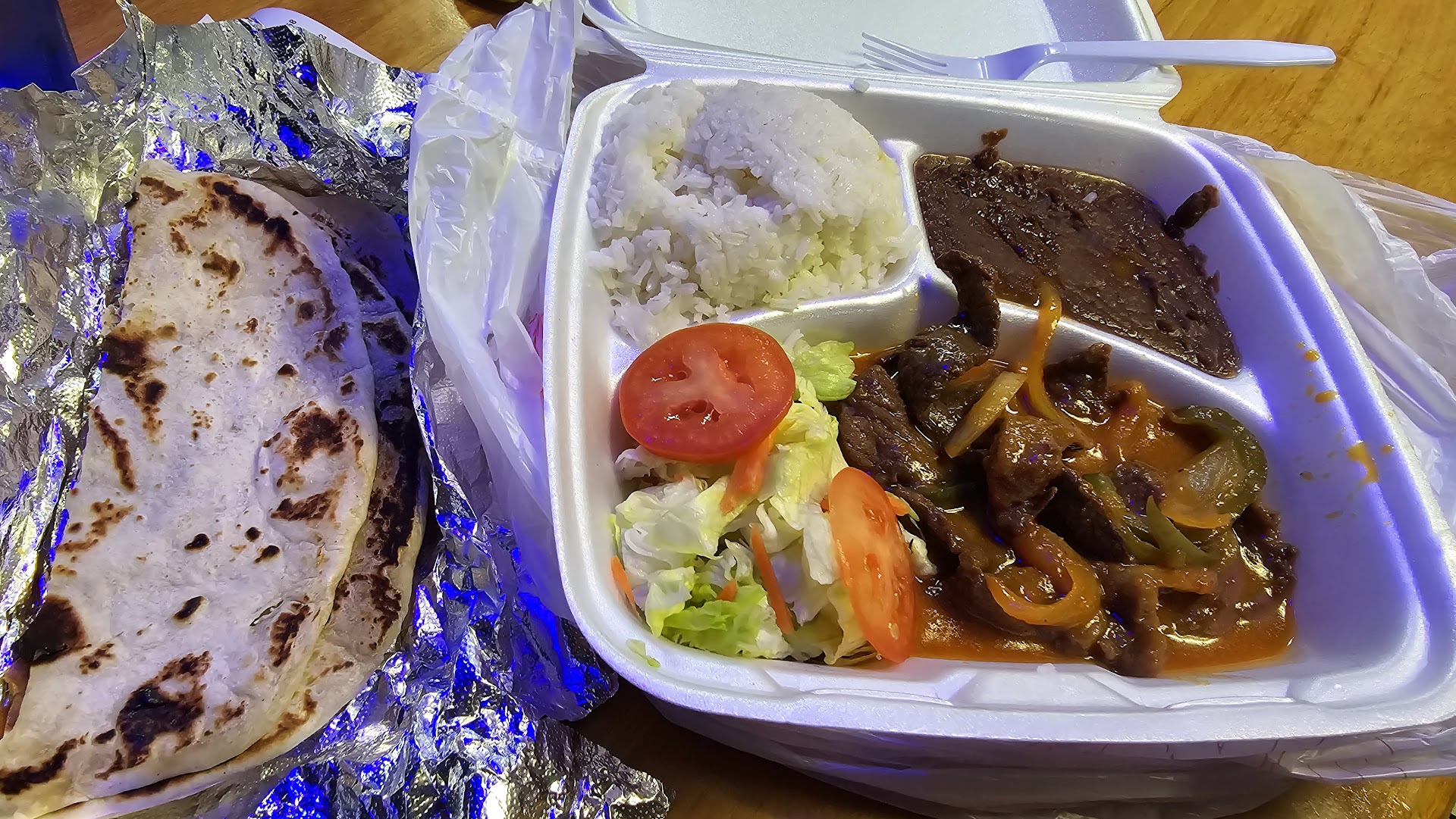 Read moreEverything on the menu looks so good, it was hard to decide what to order! So instead of buying everything, I settled on the Bistec Ranchero. It's a simple yet delicious plate of what I believe is fajita beef and bell peppers and onions in a really nice tangy and savory sauce which was served with white rice, salad, and some very dark and tasty refried beans and 2 fresh made tortillas that were so soft and warm. Everything was great individually but after tasting, I put everything on the tortillas and made a burrito. Delicious! Nothing spicy here but...