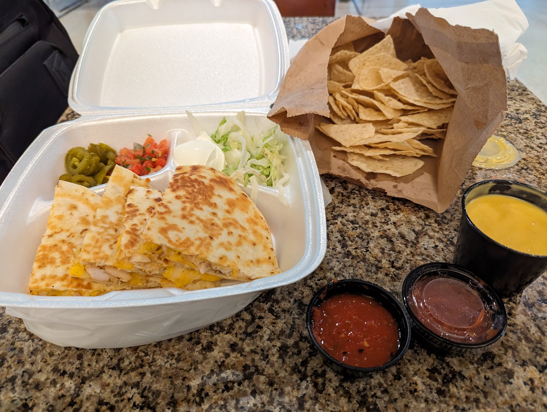 I ordered the chicken quesadilla with chips and queso. This brought my total to $25. What I received is a tiny quesadilla on a regular tortilla, lettuce with brown spots, a tiny bit of pico de gallo and some pickled jalapenos. I also asked for some salsa to go with my chips and queso, note, the chips and queso are personal sized. NOTE: they refuse to do a la carte. Quesadilla was average, 3/5, nothing great but chicken was tasty and tortilla was crisped good, though small. Pico was also average, 2/5, mostly just tomato though. Salsa comes in tiny containers, didn't have very bold flavors, but was a salsa, 3/5 Chips were horrible. 1/5. Tasted burnt and kind of like a toasted nut, odd, obviously not made fresh, from some bag, much worse than even tostitos. Do not order. Queso was tasty, but only in the regards for very cheap queso. Obviously from a mix and just not authentic. 2/5. Tasted pretty good on the quesadilla.