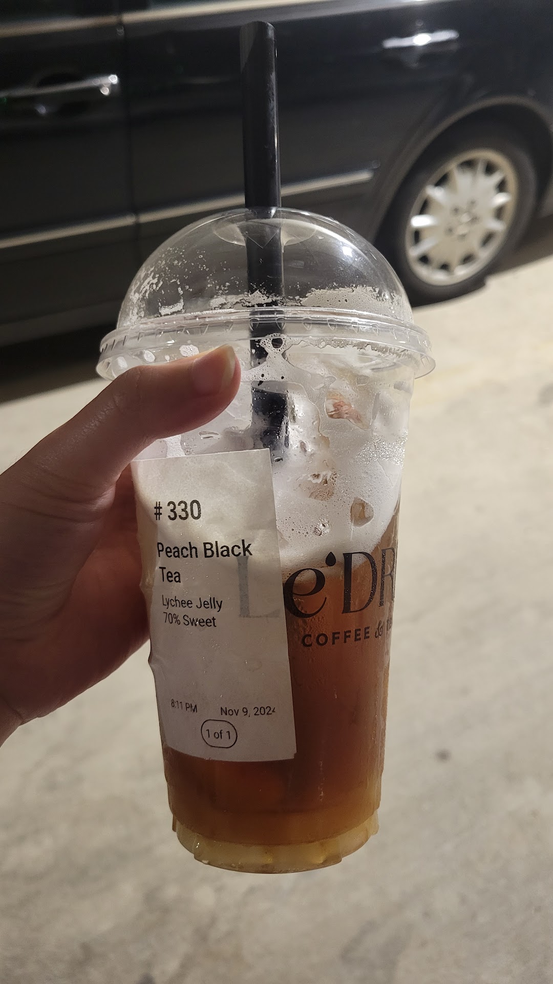 Read moreI ordered a Peach Iced Black Tea with 70% sugar and lychee jelly. Unfortunately, the drink had a very acidic and bitter taste that I didn’t expect, even with the sweetness level and lychee topping. Wondering if it could be adjusted, I asked a staff member—a young woman with brown hair and glasses—if it would be possible to exchange or remake the drink. She was understanding and respectful, explaining that store policy didn’t allow for changes, and then went to the back to bring over her coworker.