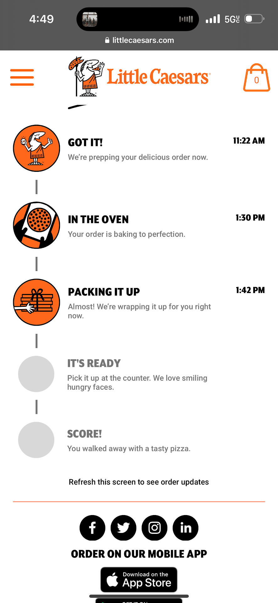 Then, I looked at the receipt and I realized I paid for a personal PEPPERONI pizza. So even the order was wrong! We went inside and stand in line (completely defeating the purpose of ordering via phone and trying to pick up in the drive-thru) to find out where our pizza was....it had BEEN ready!!? But we were never “waved at” to let us know.