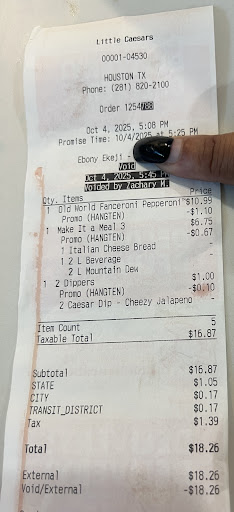 Read moreThis particular Little Caesars restaurant has basically change my mind about ordering from any other Little Caesars restaurant at all (;meaning that I won't choose that place to spend my money or suggest Little Caesars.) Yesterday evening, I showed up to the restaurant (@ 5700 W Little York Rd, Houston, Tx) and ordered a pepperoni pizza (which would be already made) and a pepperoni and sausage pizza which would take eight minutes to be ready). [I told them I would be back 'cause I wanted to go over to the 99 Only Store-to get a drink.] I went over to the store near by and bought a drink and made it back to the establishment in-time... and I still had to wait like five minutes for my order. After I received my order, I realized that they got my pepperoni and sausage order wrong (;which was a order I ordered for my parents, although I traded two of my pepperoni pizza slices for my parents'.) My parents began to eat their pizza and not realize that they were missing the pepperonis from their pizza. But as soon as I examined and bite into one of the traded slices of pizza, I knew they the order was wrong. So, later that night I went back over to that same restaurant and requested them to give my parents and I a fresh set of pizzas. The manager agreed to give me two fresh whole pizzas (and said that he could only do this request only once) but change his mind afterward without informing me and gave me only the pepperoni and sausage pizza after it was supposedly (completely) finished. The manager and two of his employees (being in their twenties) was arguing with me and intended to make me feel bad (with their sni' comments). They gave me the mess up ordered corrected... but now I will choose more sophisticated restaurant for pizza (like, Pizza Hut,...