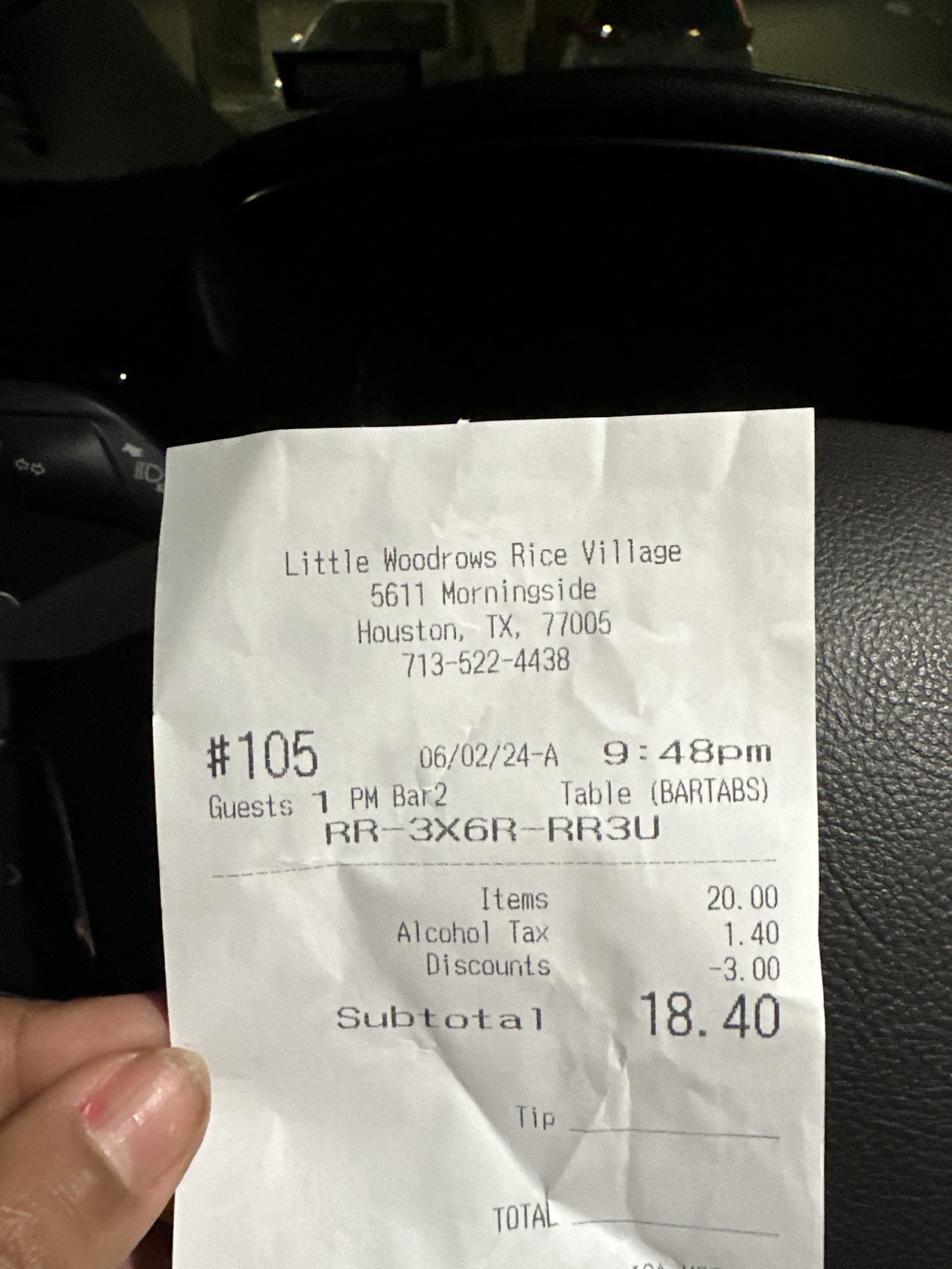 Read moreCame here after work. The brunette bartender said they only do industry discounts but still honored it because we work in the village. I ordered 2 margs for myself and 2 for my friend. Our total was $20 and the industry discount was $3. I NEVER tip on my card so whatever cash I had I tipped which was a $1 and change. The bartender returned and was upset that I tipped 10% and said “ I work on tips and I hooked you up, the least you could have done was tip me more”. I explained to here that I do not tip on my card, she did not care. Me and my friend left and did not finish our second drink. We used to come to Woodrow’s after work all the time and had a great time. NEVER AGAIN! I miss the old bartender, I’m glad she moved on in her career but I had better customer service with her and tipped her well because she was very attentive and friendly versus the experience I...