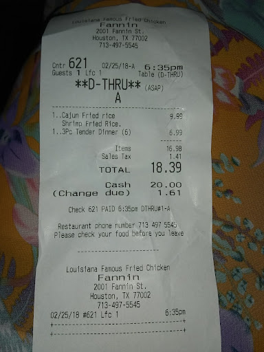 Read moreI was actually going to get a fountain drink beverage from the gas station diagonal from this restaurant called Louisiana Famous Fried Chicken until I seen a sign that said open for business so I decided to get a drink plus a whole meal which concluded a 2 piece leg & thigh, substituted the fries for some wholesome red beans & rice with cut up sausage in it!!! Everything was so natural in flavor meaning I did not have to add salt or pepper it had it's own seasoning along with a kick of black pepper. Anyone looking for food with no salt this is the place. It was not salty like some other restaurants. They even asked you would you like to dine in? I haven't heard that phrase in while. Even though they did still practice self distancing within the restaurant. You still had to mask up when ordering. The restaurant was clean and they even welcomed customers as they came in. They even had music playing on the intercom. Very soothing. The atmosphere was pleasant. Some customers sat and ate , some ordered over the phone so they can come and pay and leave. Then some customers ordered in person and waited. There ladies rest room is over stocked with toiletries and it is very clean. I give this place two...