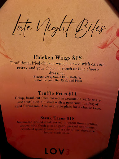 I was very disappointed in my experience here! I chose this place based on reviews on Tik Tok however my experience was the complete OPPOSITE. My cousins and I host monthly dinners/brunch and we try a new location each month. We chose Lov3 for August. Making the reservation online was no problem. It was for 2 hours which is common. Got there for our reservation time of 8:45pm and was seated and saw signs that 20% gratuity was included on all checks. This is common as itâs normally 6+ of us but this time it was only 3 people so the gratuity rate seemed odd. 20+ minutes passed and no one came to our table. We ended up having to flag down another waitress to ask for our waitress and eventually she came. We decided to go ahead and place our food order while ordering drinks. The atmosphere was nice, we went on a Saturday and it was R&B night. They had a lady there doing performances with fire, which was really cool. Some time passed and we realized that our food hadnât come out so we just stopped our waitress when she finally passed our table. She said that the food for the table next to us had just come out and that we should be next and that the kitchen was behind on orders. This mightâve been about an hour that passed already. More time passed and we realized we were nearing our two hour reservation end time but still no food. We had about 20 minutes before our reservation time was to be up and we still didnât have any food. The waitress hadnât been back to our table either. At this point, we were ready to go and had decided that we would just leave cash on the table for our drinks and leave because we couldnât find our waiter to get our checks and we were starving. We ended up finding another waitress and asked them to flag down our waitress and to bring the manager. While waiting, we noticed that the police officers/security guard was standing in an area near our table, as if they were watching us to be sure that we didnât leave without paying for our drinks. The manager eventually came and sat down. We were frustrated and asked to cancel our order and that we wanted to pay for our drinks and we were ready to go because at this point it was almost 2 hours which is when our reservation was up. The manager apologized, explained that they would extend the reservation time and that our food would be on them. He also offered us drinks on the house. Some more time passed, we reminded the manager that our order had substitutes and to be sure it was put in correctly. He went back to check on our food,some more time passed and eventually it came out. Our sides were on plates, but our main entrĂ©e items were packed in to go containers that were in bags. The food was cold so we didnât enjoy it. We all had lamb chops with either mashed potatoes, cabbage or asparagus sides. Oh did I state they wouldnât let us substitute sides so we had to order an additional side since 2 of us donât eat mashed potatoes. Everything was cold! The manager came back and asked if we were still upset with him and we said yes because our food came back cold. He said he would handle it and walked away. The waitress came and charged us for our drinks, which included $7 for a bottle of water . We paid and left. As we were walking out, we ran into the manager outside and he tried to explain and apologize again, stating that he was getting on the chef because he had spoken to him directly and asked him to remake our food and he was upset that the food still came out cold. He kept apologizing and said that he understood that we will probably leave a bad review, but that it would help give him the leverage he needed to correct the situation in the future. This was not a great experience though the atmosphere was nice and seems like a great grown and sexy place especially for date night the service was awful! I can say the manager did his best to try to remedy the situation but there wasnât much he could do. I will not be back to this place unless Jesus reveals to me that my future...